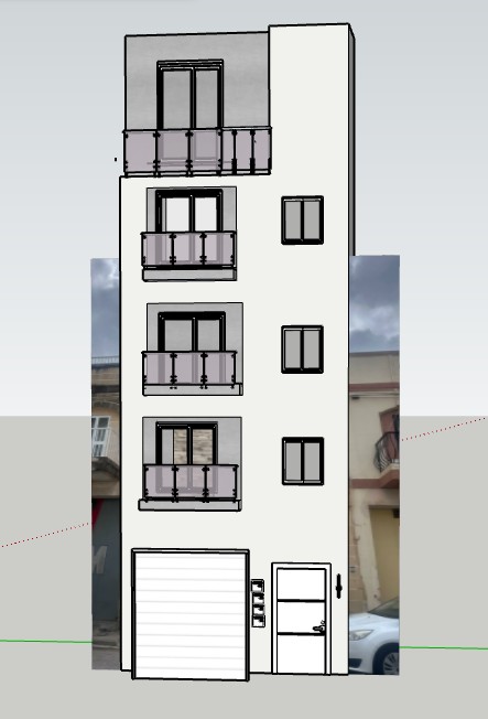 ultra realistic architectural render of the provided sketchup facade this is an image to image enhancement strictly preserve the exact front elevation view camera position proportions and composition do not change angle perspective framing or geometry in any way material distribution must follow model exactly main facade surfaces smooth painted masonry rendered plaster in a light neutral grey tone feature elements horizontal bands and balcony zones grey concrete look tile cladding main facade painted grey light warm grey slight beige undertone not cold grey smooth clean matte finish very subtle fine plaster grain no stains no aging no patchiness feature bands concrete look tile medium grey tone slightly darker than facade refined architectural concrete look smooth or lightly textured minimal joints clean modern finish balcony railings clear glass balustrades minimal framing realistic transparency and reflections apertures important all window frames and door frames must be crisp white clean sharp modern finish no dark frames no black or aluminium appearance important maintain clear contrast between facade and feature bands no blending of materials no stone or travertine textures lighting natural daylight soft shadows balanced exposure context keep surrounding buildings exactly as in the original image no redesign or reinterpretation rendering style high end photorealistic architectural visualization clean minimal contemporary strict constraints no camera movement no perspective change no material reinterpretation no additional textures beyond specified materials important treat the input image as fixed and only enhance materials and realism