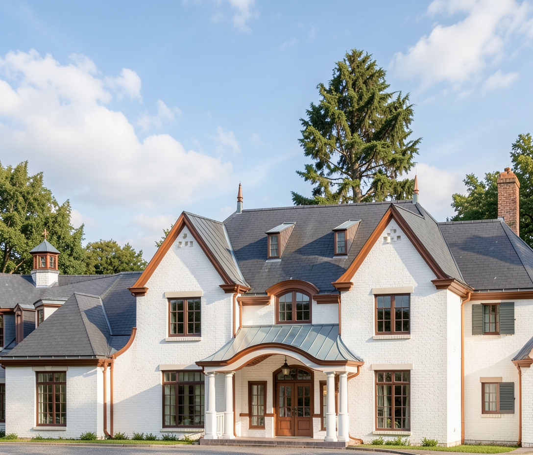 a serene countryside pool house surrounded by lush green trees with sunlight streaming through the leaves casting soft golden rays the house is painted in a warm cream color complemented by soft olive shutters the roof has a gentle grayish blue tone the atmosphere is peaceful and inviting with elegantly dressed people engaging in leisurely conversations the patio features muted earth toned tiles and subtle lavender and sage colored plants enriching the tranquil ambiance children playing on grass