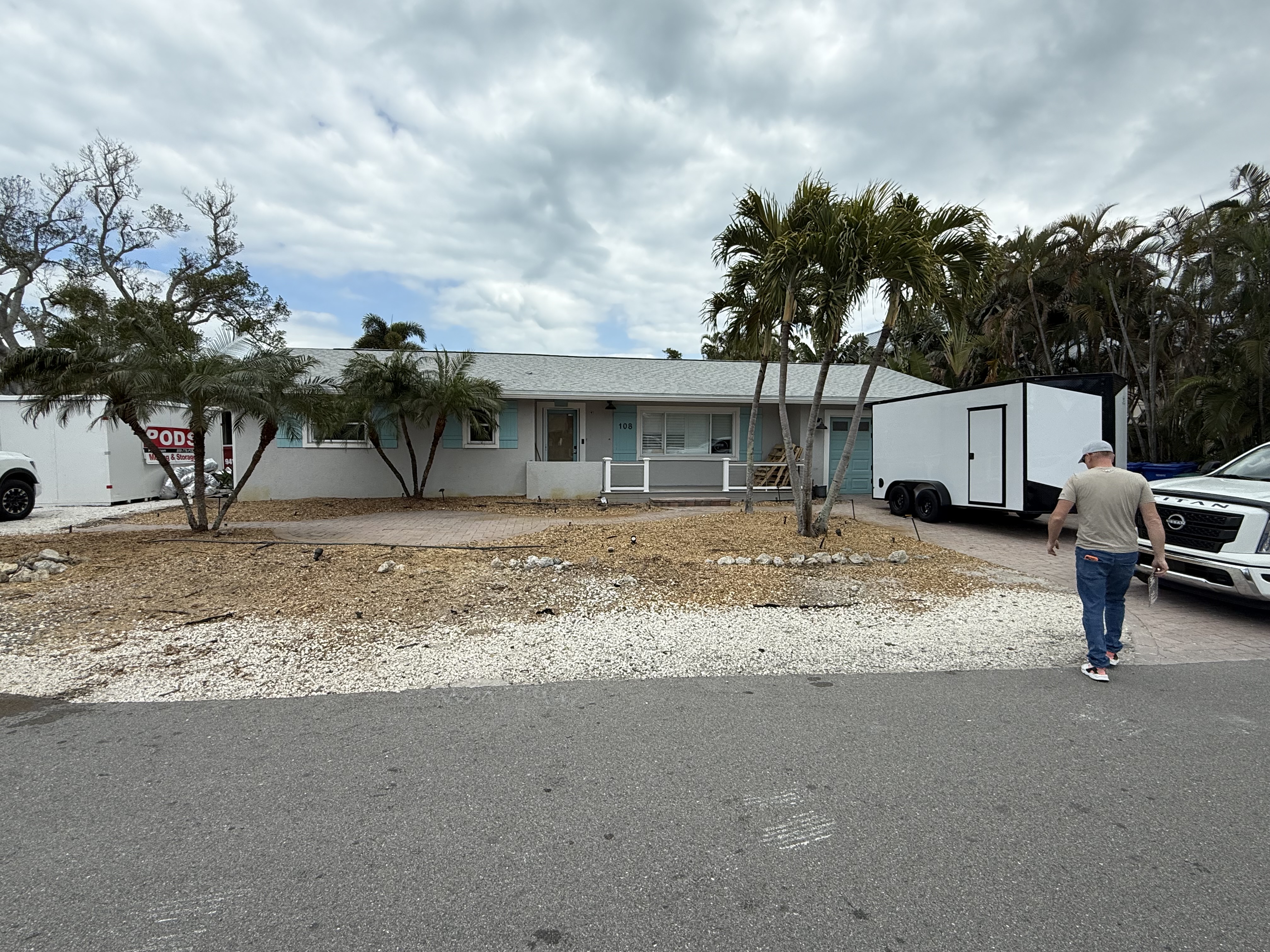 remove the front wall infront of the front door remove the person and the trailer remove all the existing landscaping add a split path that goes to the left and right towards two parking pads made of shell in the middle incorporate some type of creative turf design