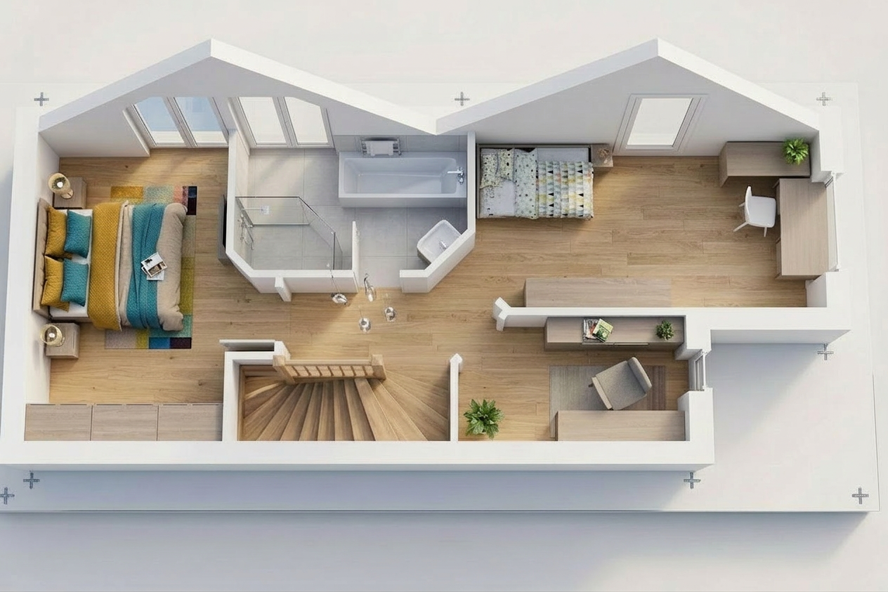 convert this floor plan into a realistic isometric 3d view of a full house show the space from an elevated angle with furniture walls and details visible passe das bestehende 3d rendering des dachgeschosses an ohne die restliche raumstruktur materialien oder m bel zu ver ndern nderung im badezimmer oben links im badezimmer zwischen fenster und dusche fehlt ein wc an der wand bitte erstelle hier ein wei es wc an der wand use the same furniture as shows on the plan do not change the orientation of the floorplan