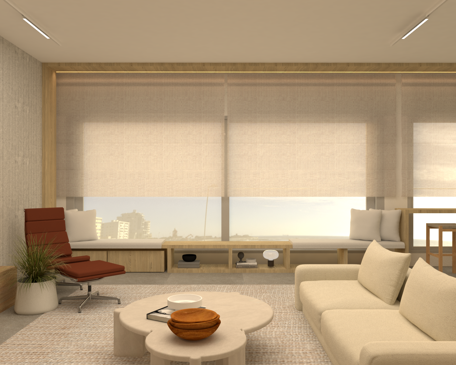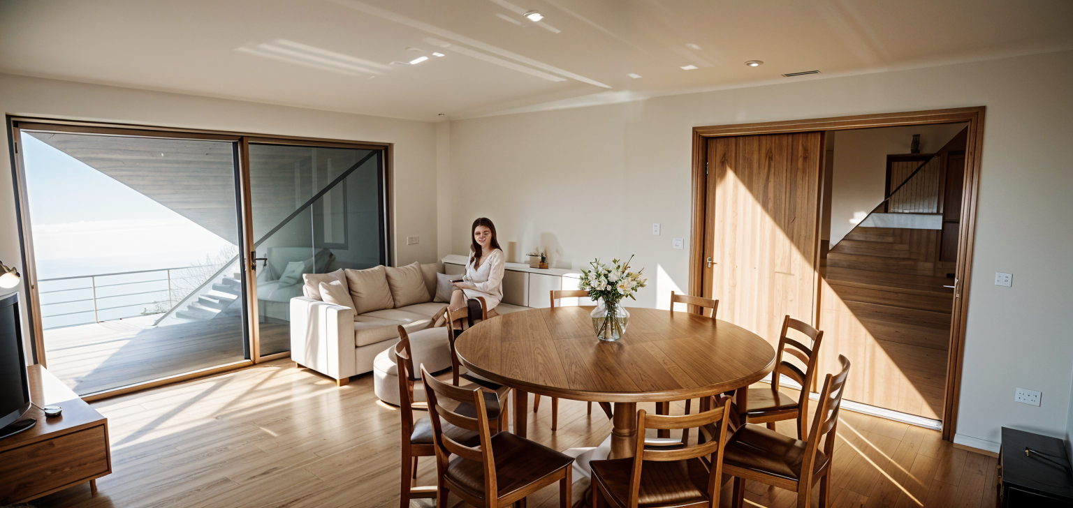 morning light with beautiful shadows grey tiled floors sea views rattan rug the interior is bright