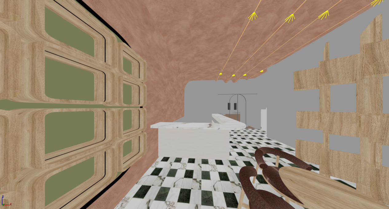 ultra realistic interior architectural photograph of a contemporary caf bar with organic mediterranean design language the left wall features a series of built in rounded rectangular wooden boxes functioning as display shelves for coffee products coffee bags jars cups each box includes integrated warm white led strip lighting 2700k concealed within the inner top edge softly illuminating the displayed coffee items and creating depth and shadow wood is natural light oak with visible grain matte finish realistic joinery and rounded corners the bar counter is finished in brushed stainless steel matte to semi matte finish subtle reflections visible material thickness clean professional detailing no glossy or mirror like surfaces behind the bar the back wall includes a designed feature element either textured plaster relief minimalist shelving with bottles and coffee equipment or a subtle graphic composition integrated into the wall adding visual focus and breaking the flat surface warm indirect lighting enhances this feature walls and ceiling are finished in hand applied clay or lime plaster in warm terracotta tones showing natural trowel marks soft imperfections and organic transitions between wall and ceiling ceiling includes discreet linear recessed lighting with warm ambient glow realistic light falloff and bounce floor finished with classic green and off white patterned ceramic tiles lightly worn matte surface realistic grout lines the entrance door at the back is a metal framed door slim profile steel or aluminum dark finish with glass panels clean industrial detailing realistic proportions furniture includes light wood caf tables and chairs with oak frames and dark brown leather upholstered seats showing natural creasing and softness soft natural daylight combined with warm artificial lighting global illumination enabled realistic shadows and ambient occlusion camera at human eye level 1 6 m 35 50mm lens straight verticals natural perspective photographic realism physically based materials correct scale subtle imperfections slight film grain style high end hospitality interior photography contemporary caf warm tactile inviting atmosphere