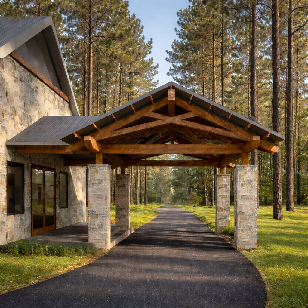 please make this more realistic the trees should be deciduous instead of pine trees make the driveway curve to the right so it doesn t look like a road