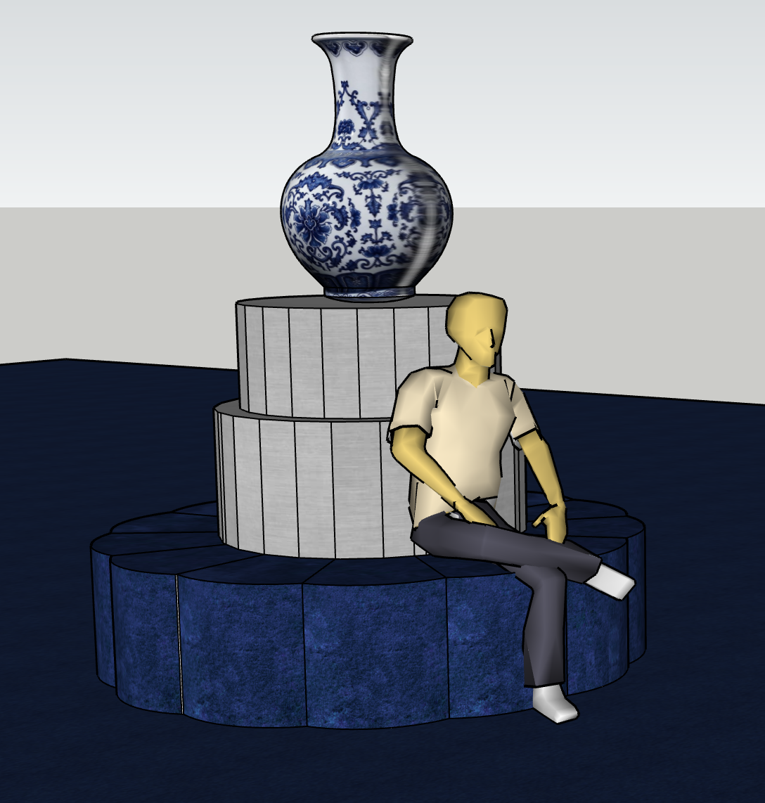 seating area the cushions are blue velvet and the back rest is stainless steel it has a vase on the top made of ceramic there is person seating on the seat