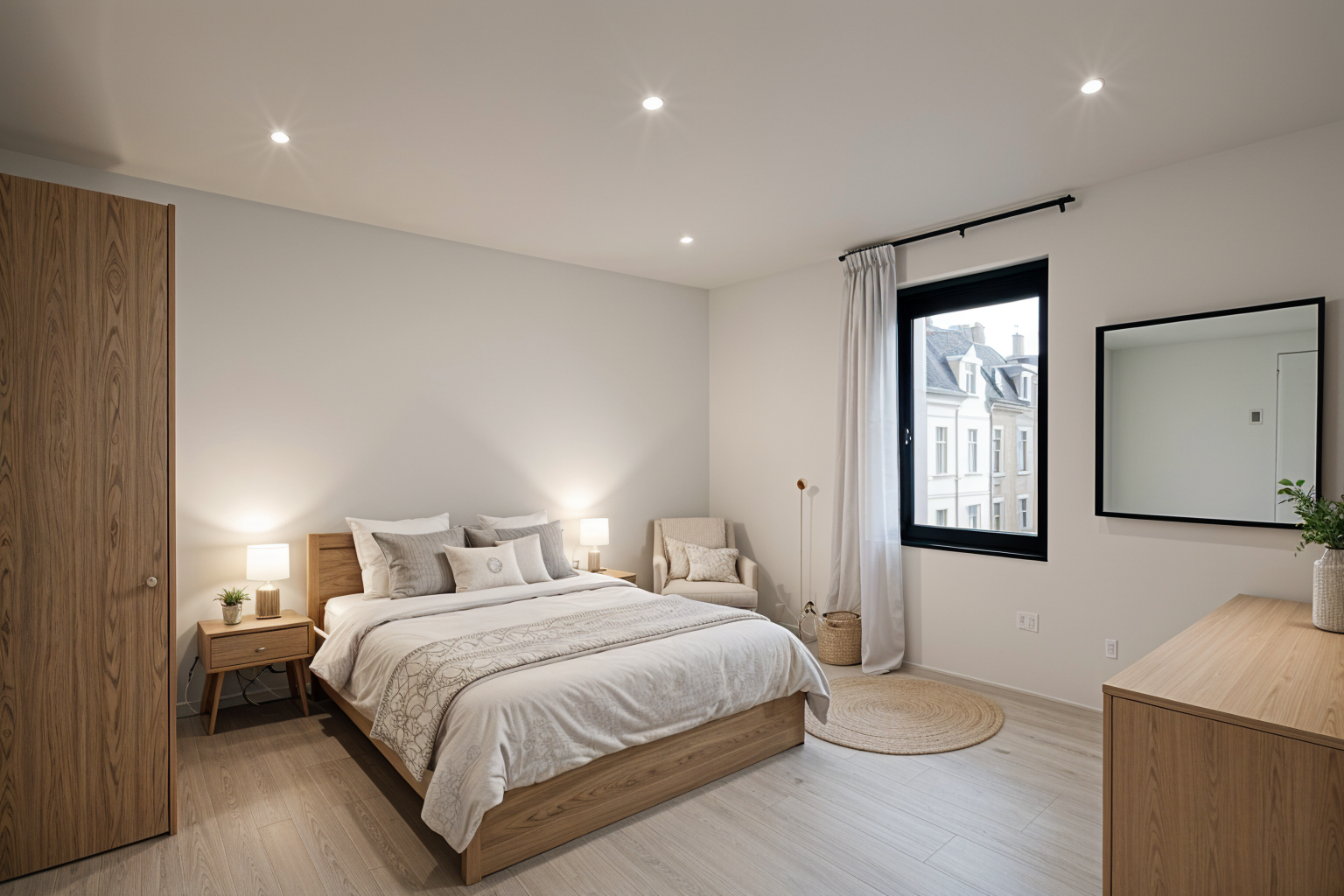 keep the room as it is with the position of the walls and window and the floor create a double bedroom in japandi style use terracotta and khaki earth tones for the decoration and textured art