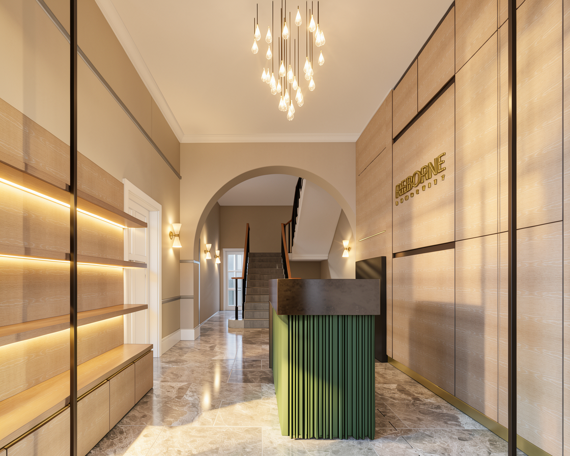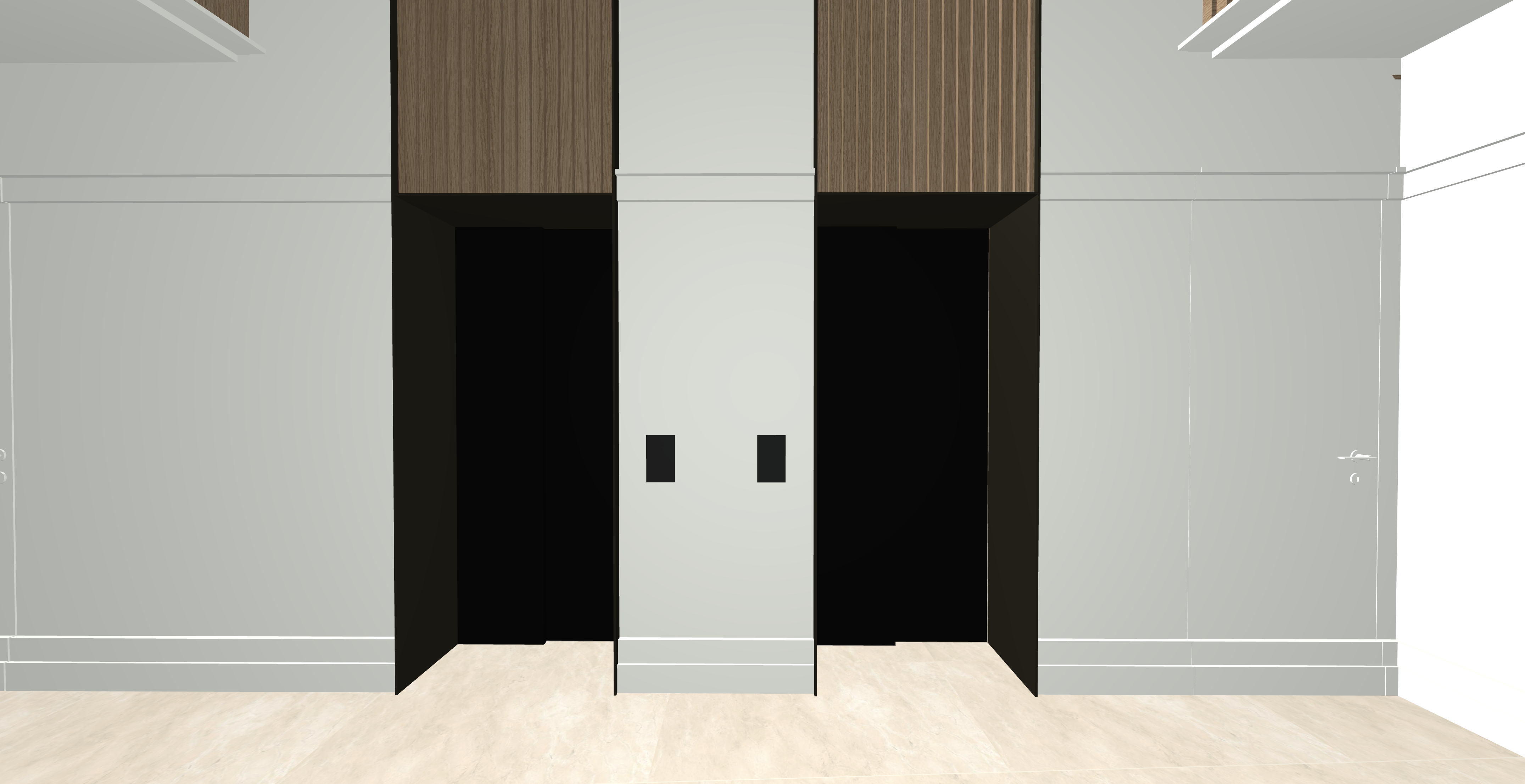 legno rovere leggermente sbiancato le ante degli ascensori sono in vetro nero