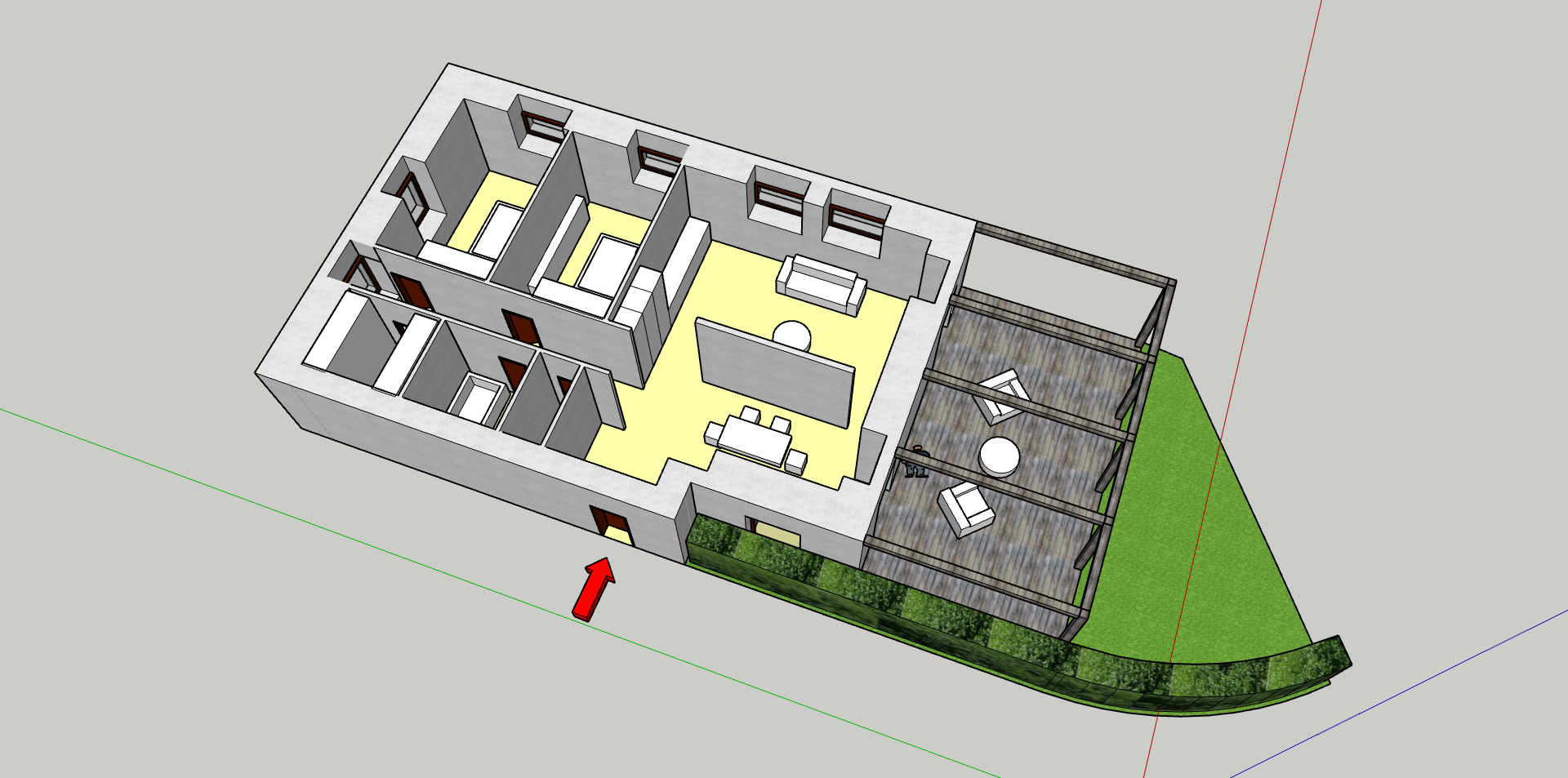 render a modern architectural floor plan with a bright minimalist style use soft gray for walls warm yellow for flooring and natural wood tones for window frames and outdoor decking highlight furniture in white with accents of light beige for a cozy feel incorporate lush green for the lawn and hedges providing a fresh inviting atmosphere aim for a bright airy environment with a sophisticated yet comfortable ambiance