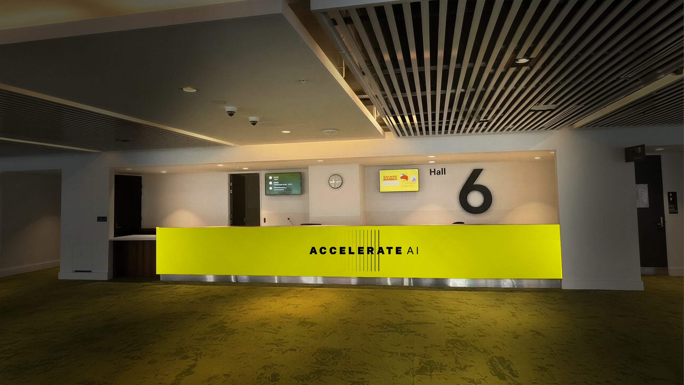 add receptionist behind counter serving a business man and woman on the left and under the right of the tv screen add 2 blur business people with lanyard walking past the receptionist