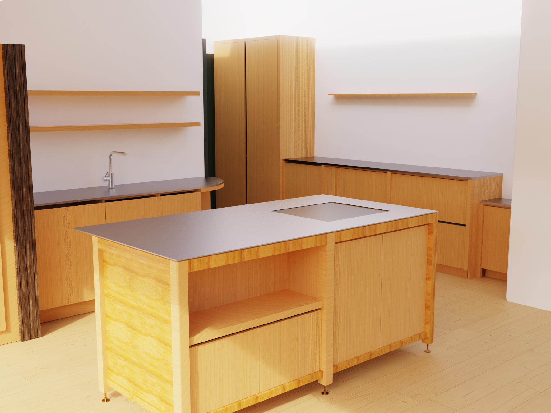 mid light oak modern kitchen with stainless steel counter tops and island with black hob