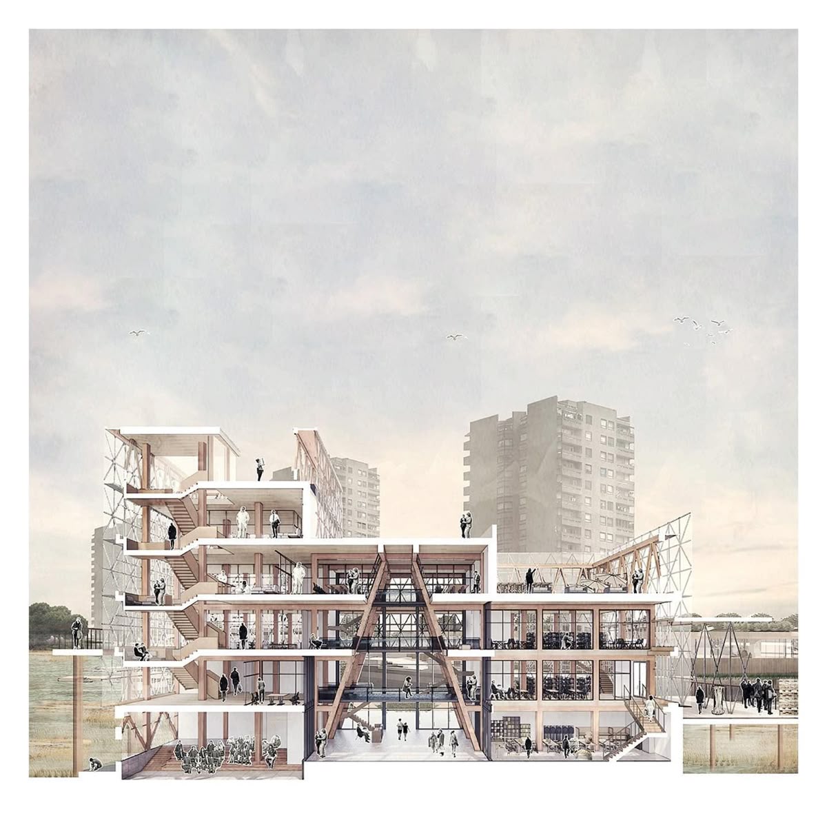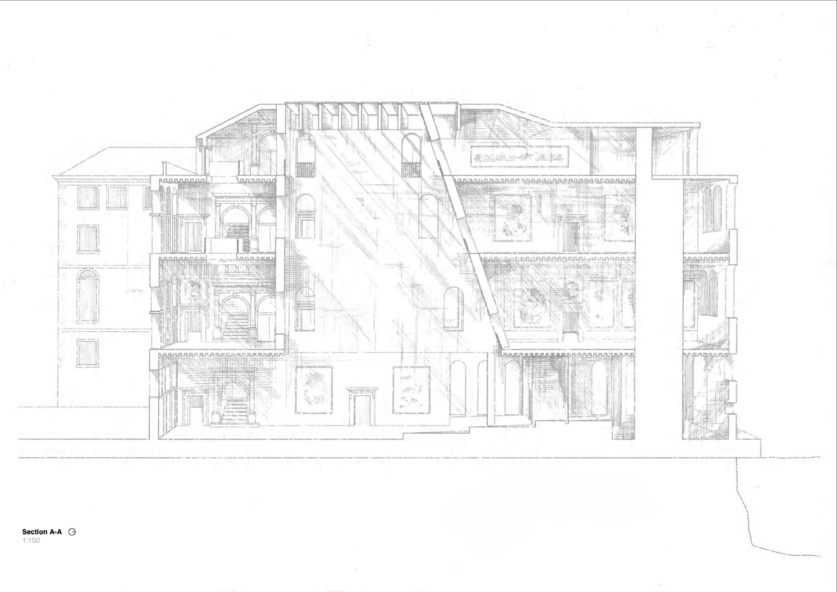 exterior shot generate a sectional perspective render referencing the attached render follow the exact proportions and size on thew existing drawing and only reference the colour and textures for the background scene create a scene in venice add people throughout the render in black section line should be white the render should be a multifunctional space creating a scene as a gallery art space