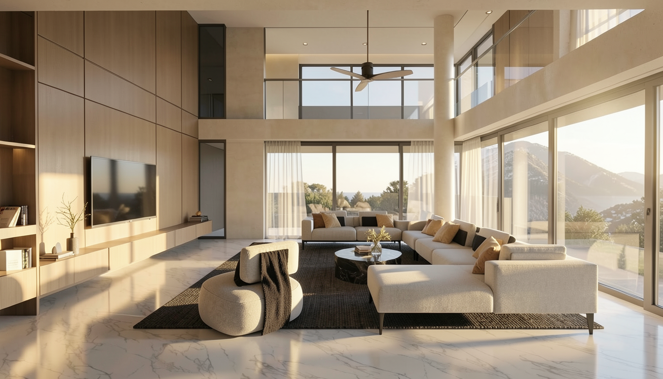 realistic look you want modern luxury interior with natural lighting photorealistic outdoor scene with soft shadows generate beautiful elevations renders with light inside with white stucco on front walls and black metal roof