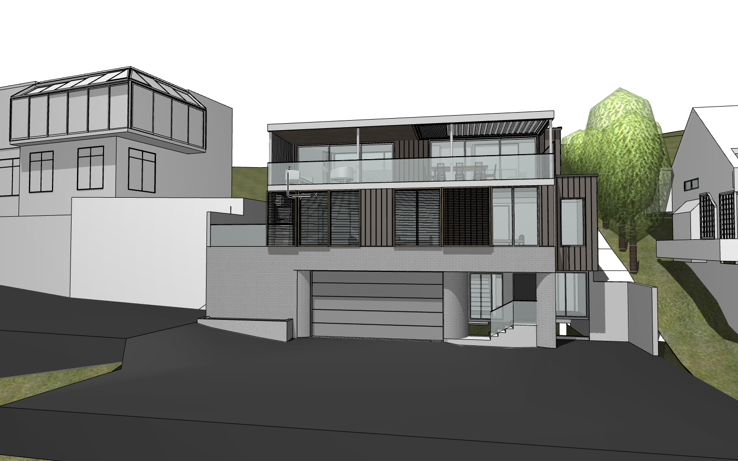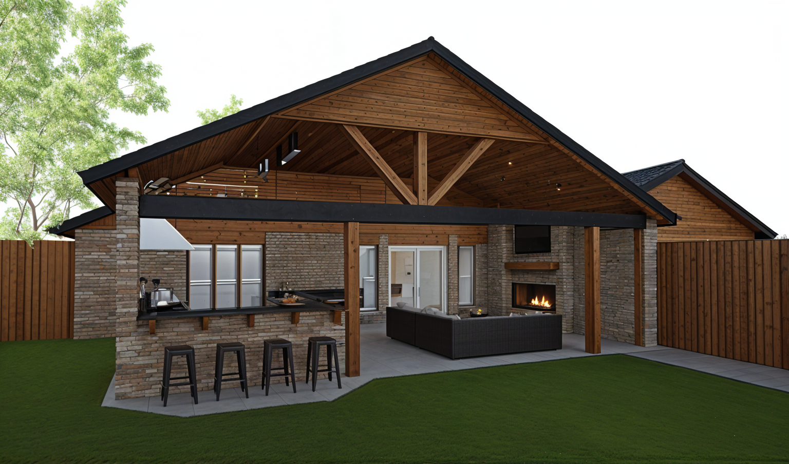 exterior shot render a grand symmetrical mansion with a modern design featuring soft gray stone for the facade and a dark gray gabled roof the entryway has a prominent glass feature reflecting the clear blue sky flank the house with lush precisely trimmed hedges and vibrant pink flowers tall majestic trees with rich green foliage frame the scene casting soft shadows on the driveway the lawn is a vivid well maintained green providing a bright contrast set under a serene blue sky with wispy clouds creating a calm and elegant atmosphere architecture