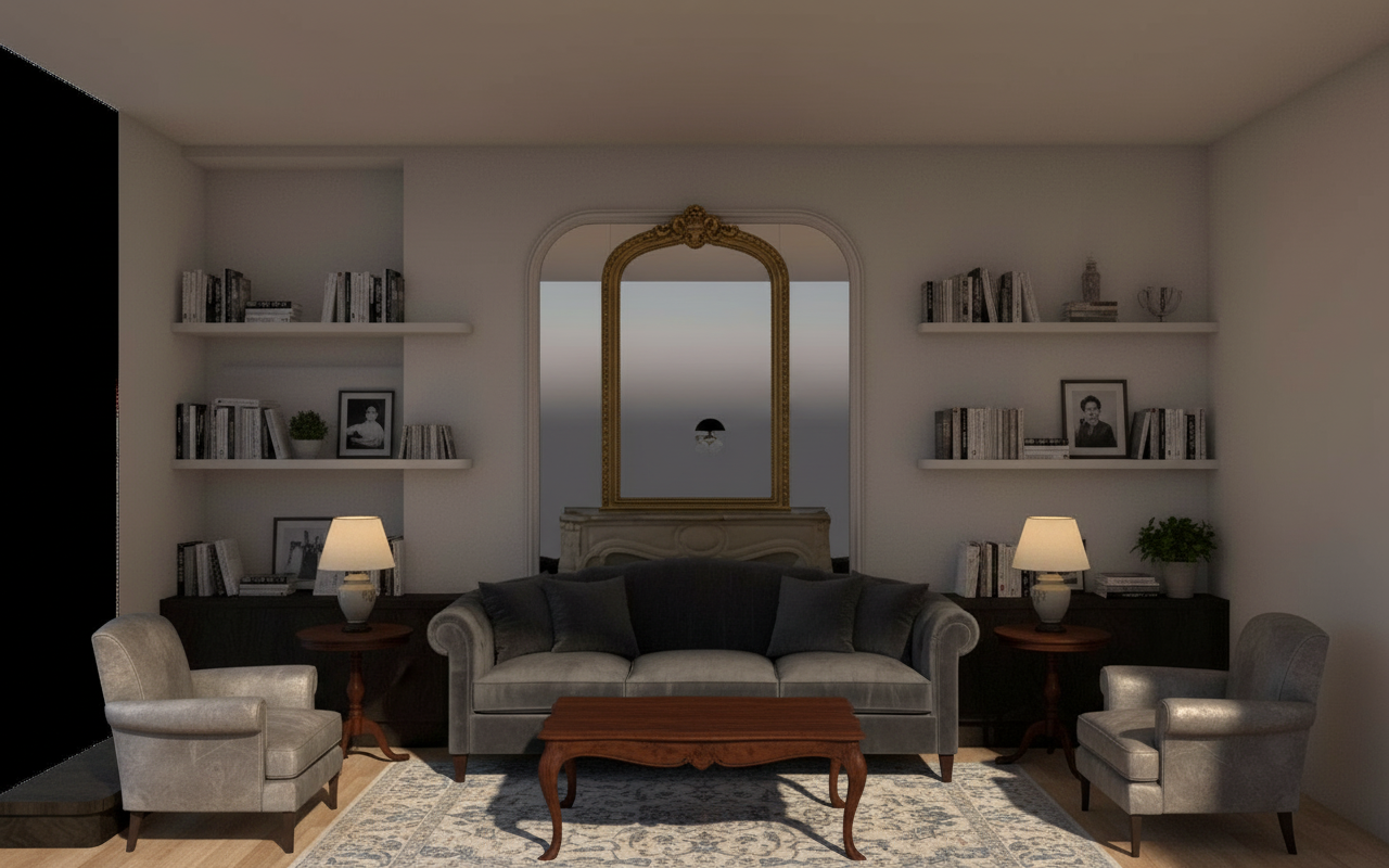 the wall sconces are flat semicircle wall lights made of travertine stone shaped like a half moon attached to the wall with soft indirect light shining upward eep exactly the same design and color palette do not change the layout furniture materials or styling