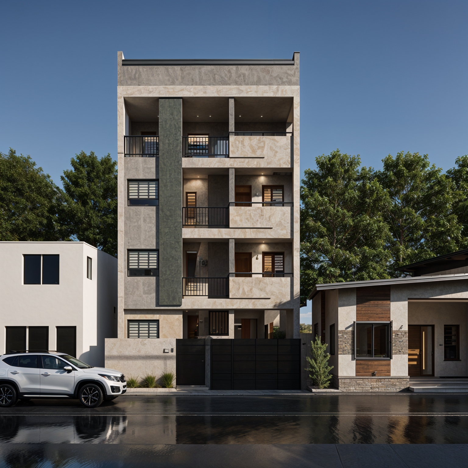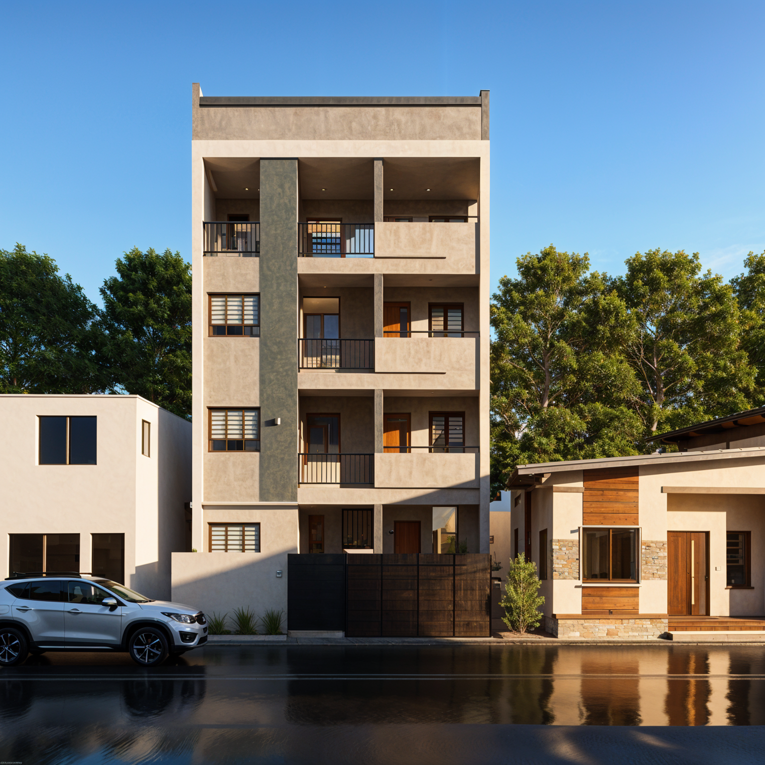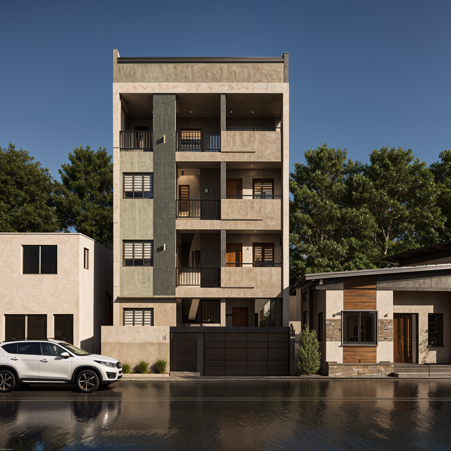 a manicured lawn layered flower beds low maintenance shrubs native plants make the exterior facade a mix of light wood and matching creme plaster