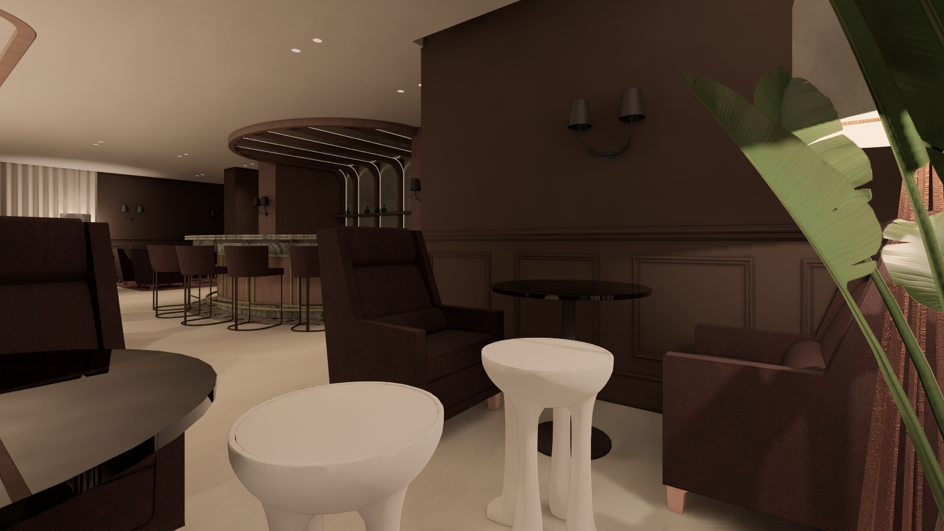 add one bartender behind the bar preparing drinks and interacting naturally while preserving the bar s structure and alignment stools should appear upholstered in brown leather with subtle natural sheen and cushioned tactile texture include guests seated at the bar add premium alcohol bottles arranged tastefully to bar shelves keep all materials as they are small table dark back wood