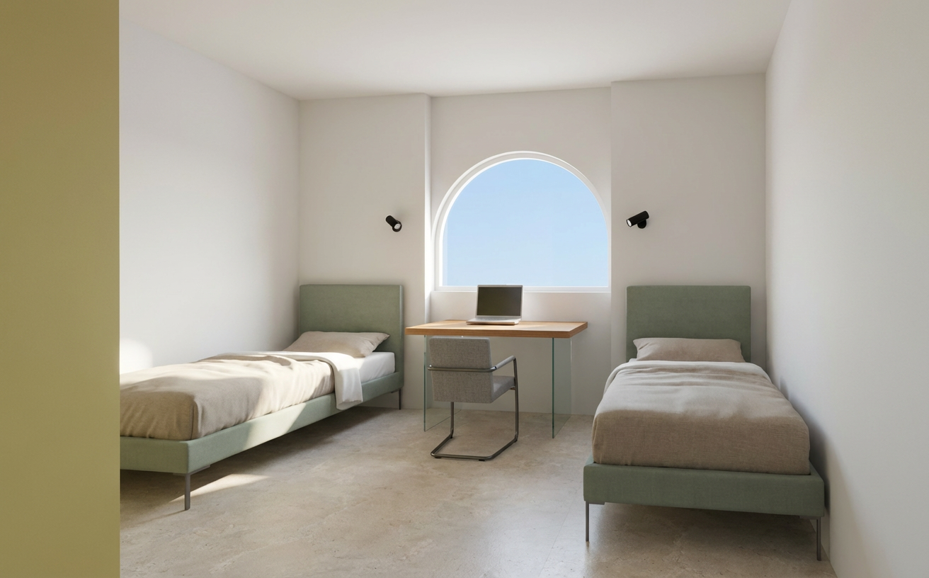 non modificare nulla mantieni texture e colori pavimento effetto cemento beige molto chiaro armadio sulla sinistra colore grigio fum in vetro