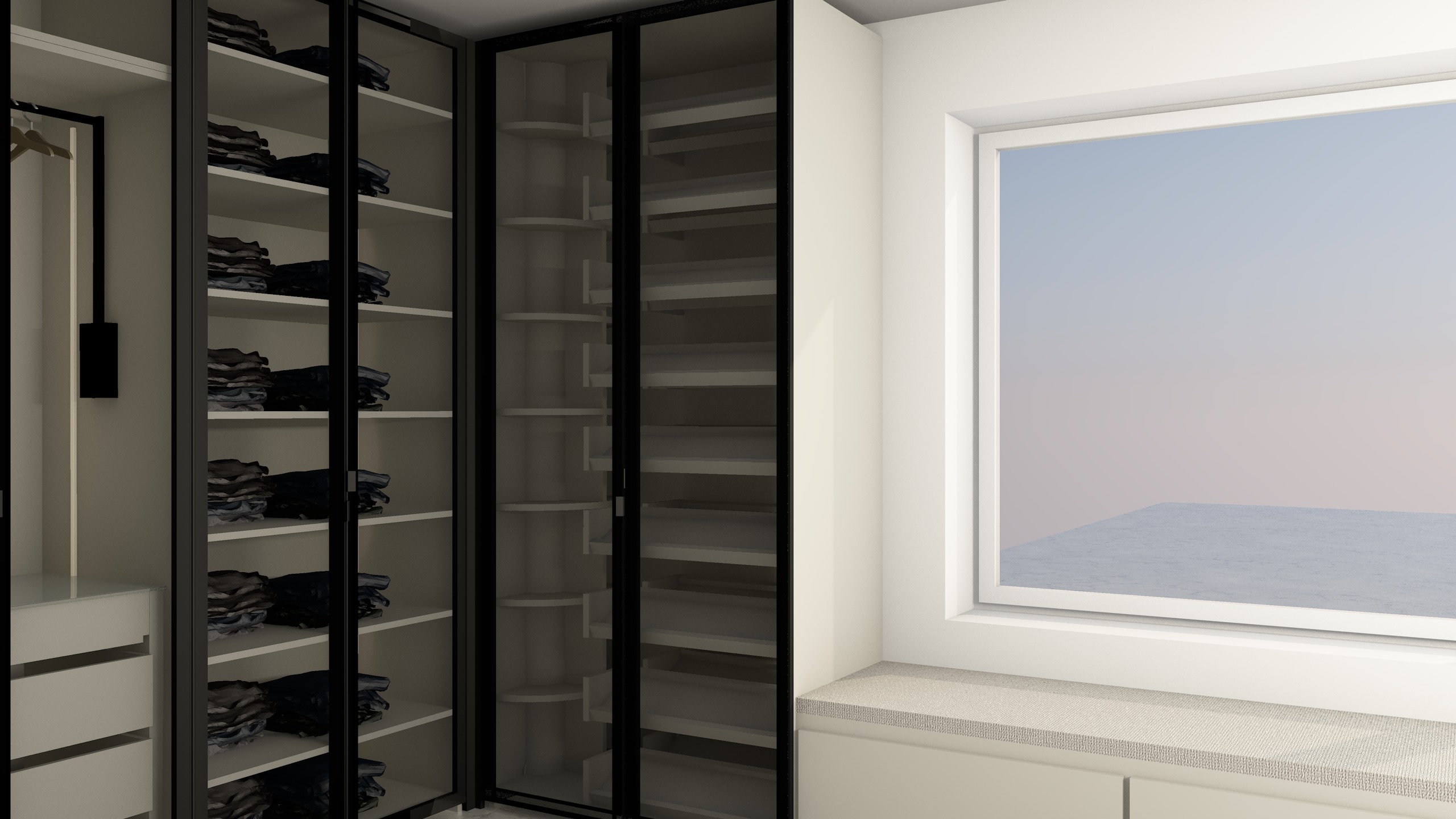 cozy modern luxury closet led lights and soft lights under the footing soft colors on the righjt side is a rolling shelf for accesoriess