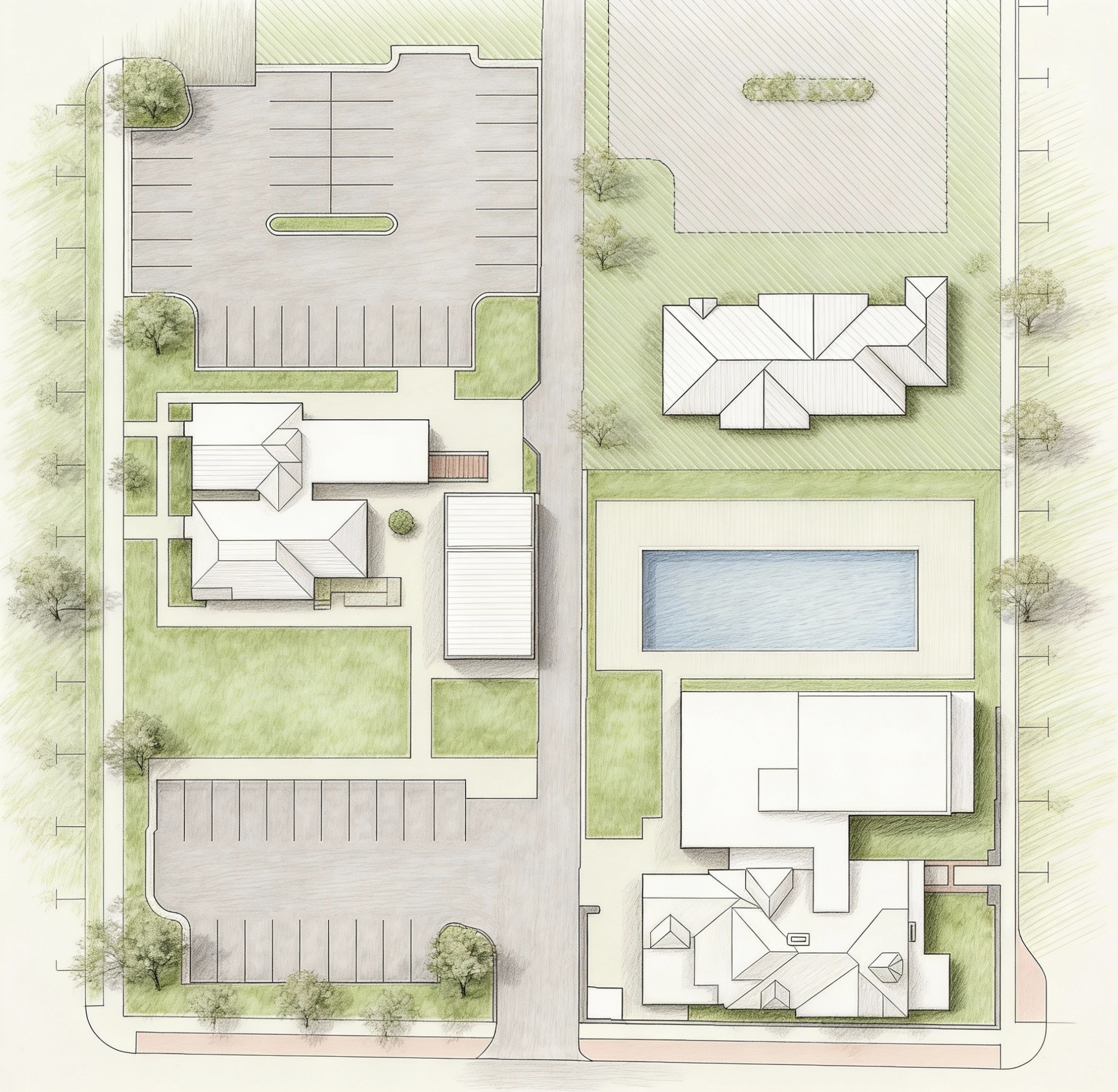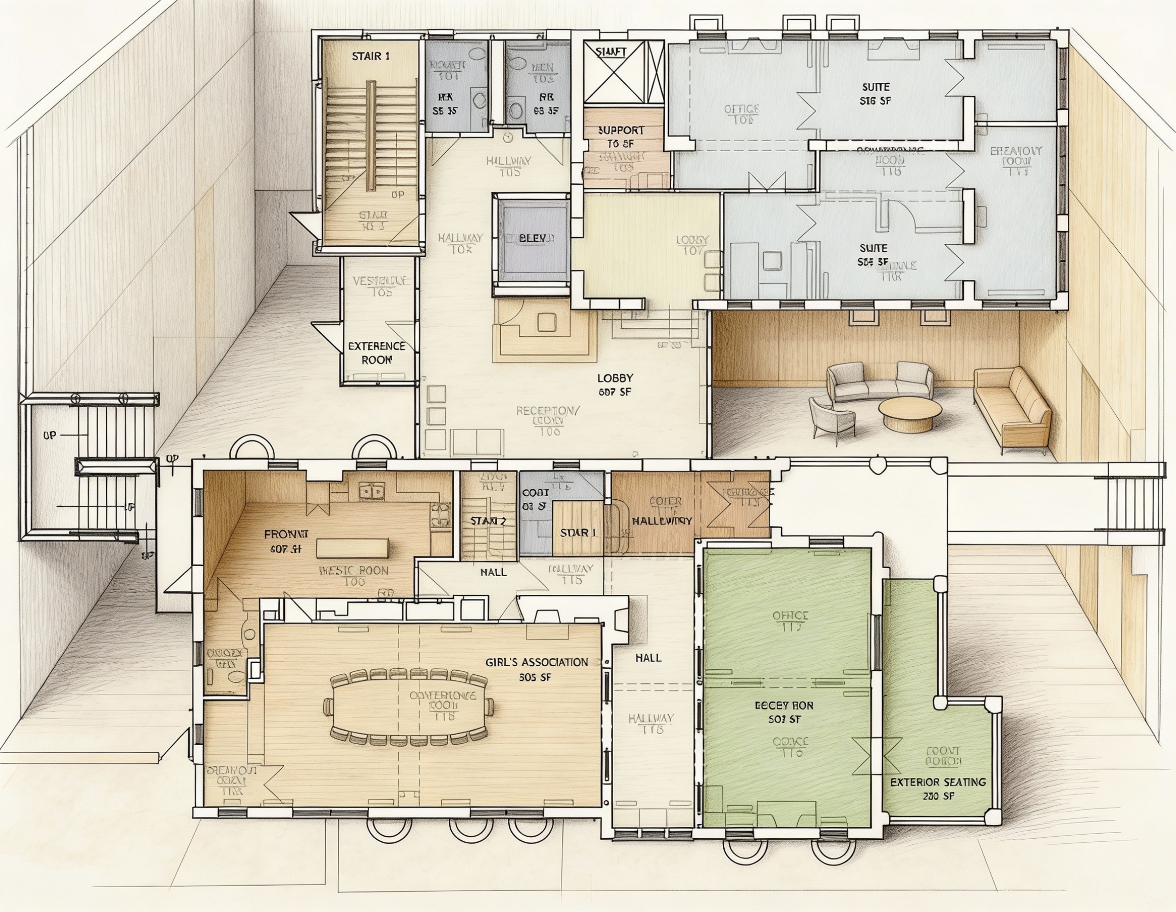 historic hotel floor plan illustration in plan view clean minimal and diagrammatic with soft hand drawn line quality and subtle sketch texture and a plain shaded background change the furniture according to the room label and then remove the label clearly distinguish suites lobbies bars restaurants clubs stairwells and corridors with restrained line weights and hierarchy calm muted warm color palette emphasizing neutral floors soft wood tones and gentle accent colors for furniture and feature areas professional quiet competition ready and visually legible evoking a historic yet contemporary presentation drawing without photorealism or perspective distortion
