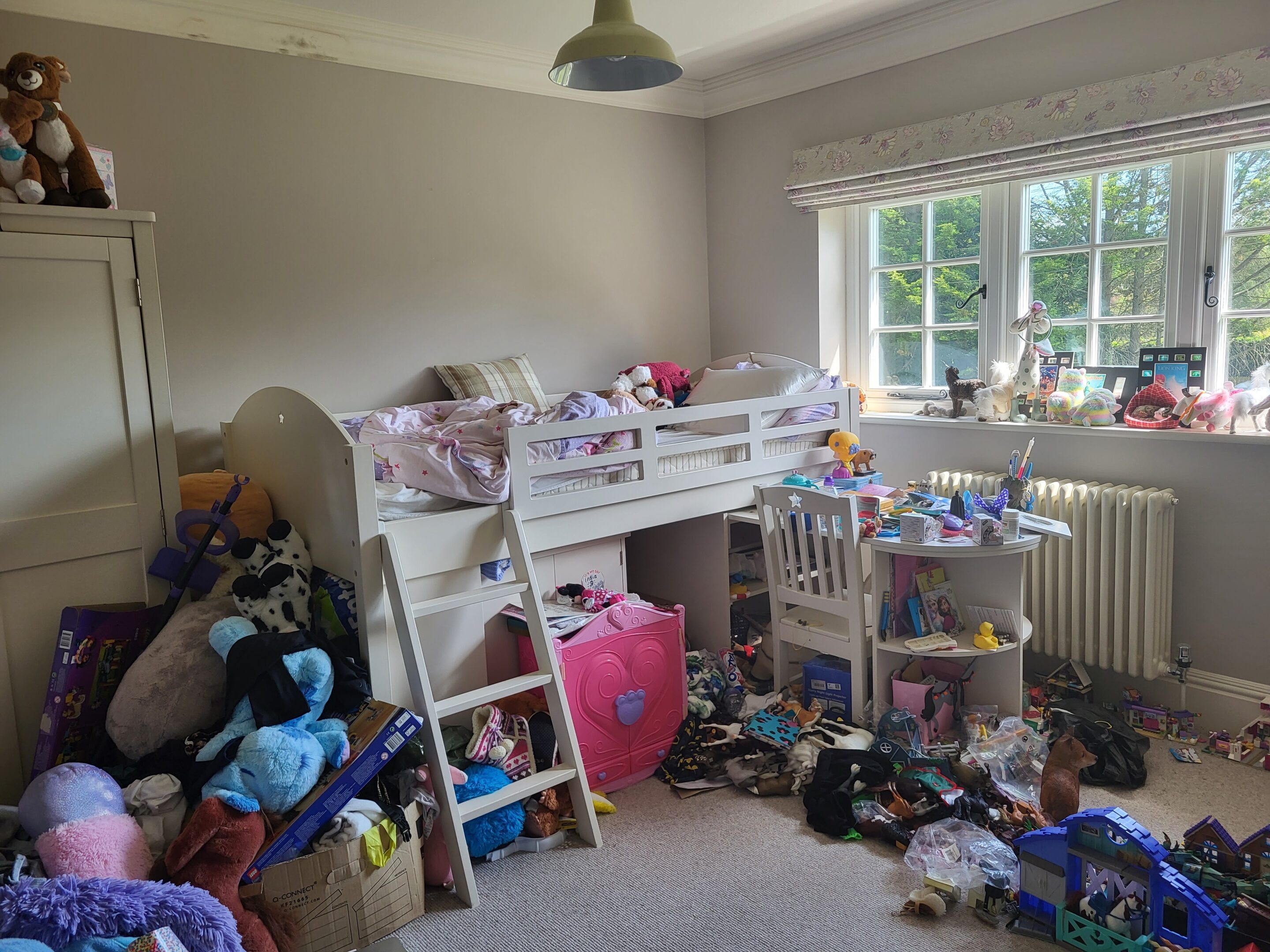 raise the bed and put storage under the bed with organized toy bins get rid of all the mess in the photo