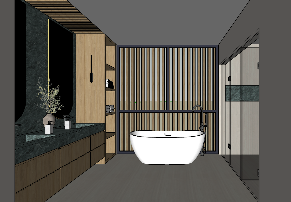 create a luxurious modern bathroom interior featuring a freestanding oval bathtub with a pristine white finish the walls are painted in a soft matte gray accentuating the warm wooden cabinetry and ceiling panels in light oak the cabinets are adorned with black handles a large dark marble countertop is complemented by minimalist black fixtures next to it green plants in elegant vases add a touch of freshness large windows with vertical wooden blinds let in soft natural light casting subtle shadows to the side a glass shower enclosure features dark marble accents enhancing the elegant atmosphere overall the scene is calm minimalist and sophisticated exuding a tranquil spa like ambiance