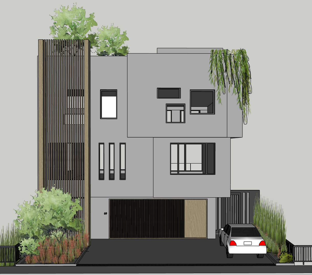 mid day sunlight mid tone gray polished concrete wall finish lush tropical greenery on roofdeck and ground floor wood tower