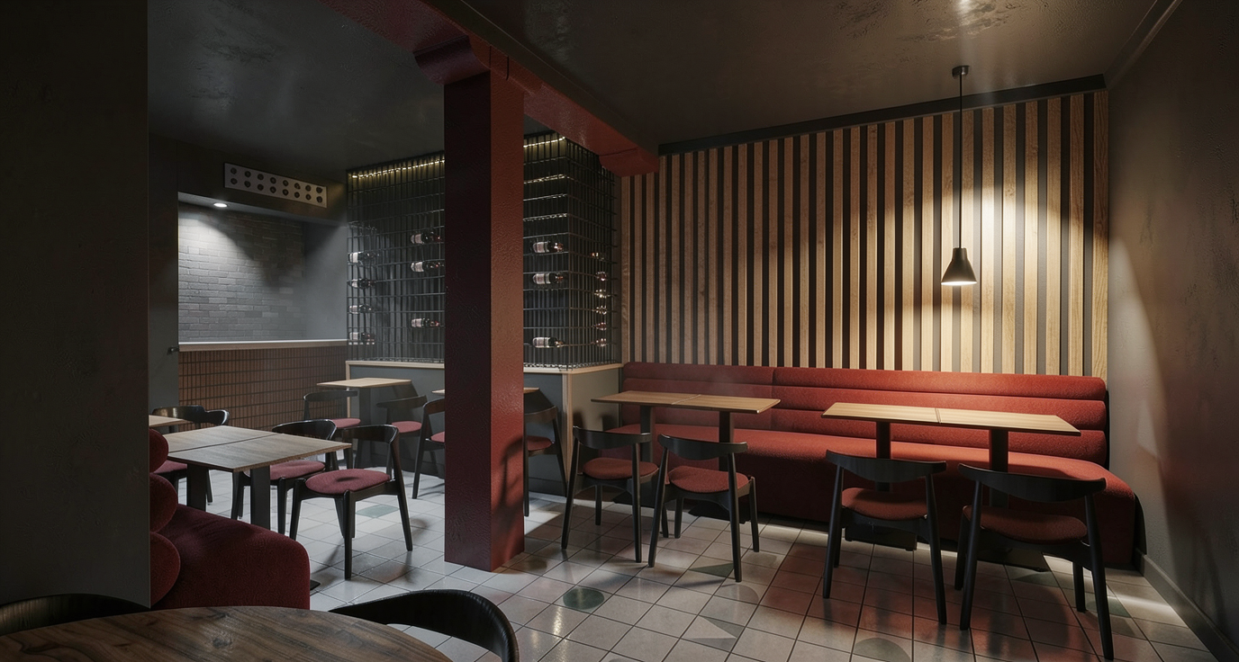 crea una imagen fotorealista en base a esta de sketchup realza las texturas manten la escena oscura quita los focos del techo aclara un poco la imagen para que se vea el fondo