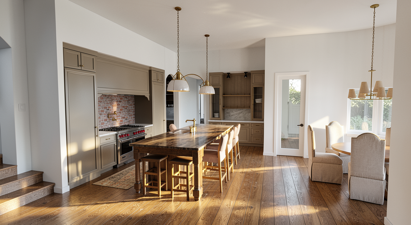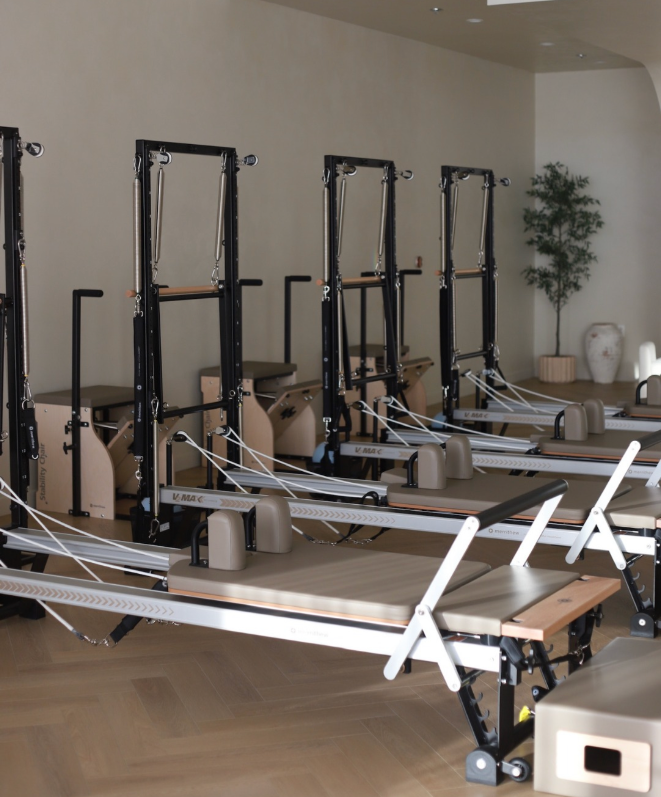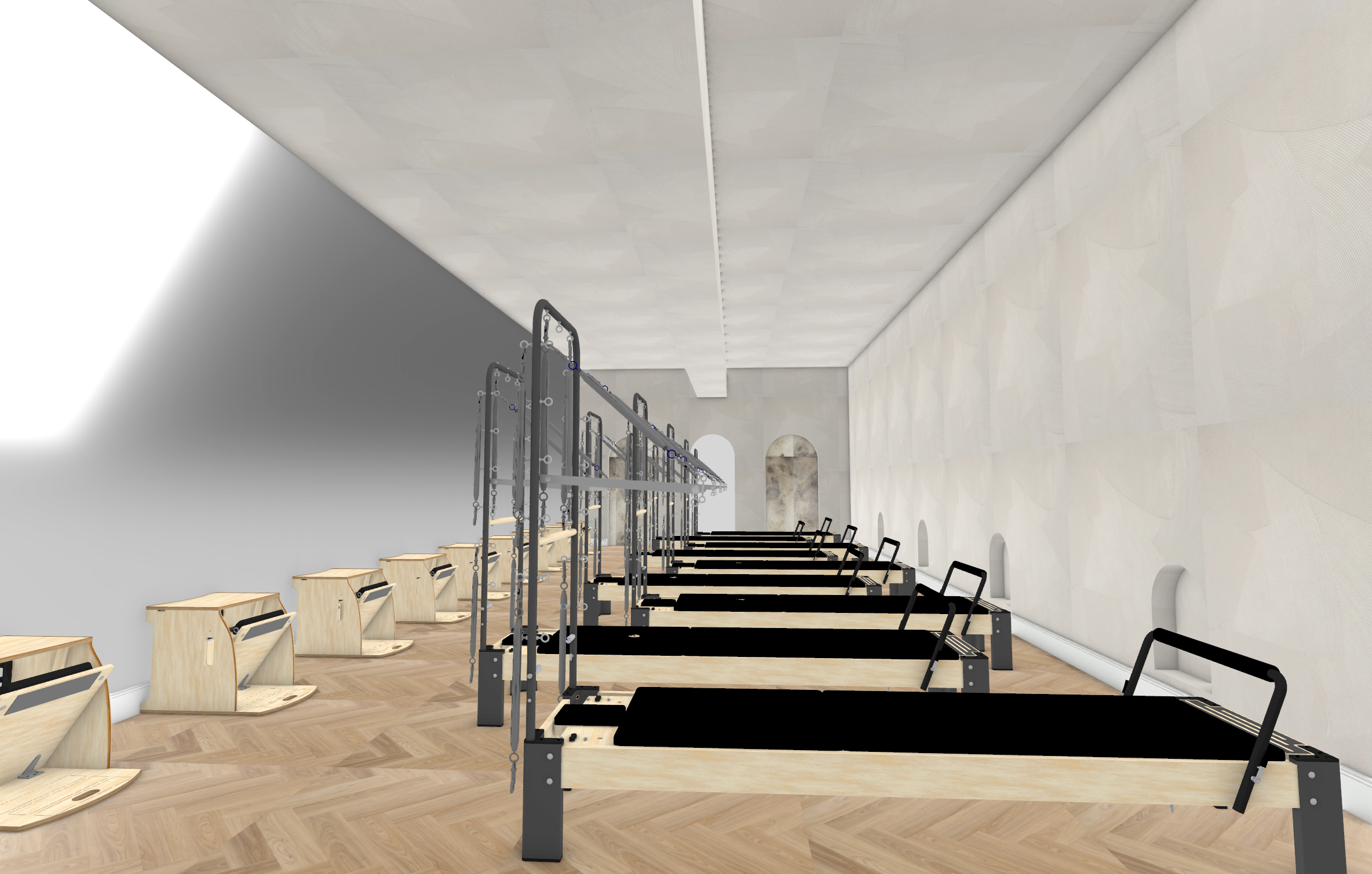 exterior shot a photorealistic interior of a modern pilates studio designed with soft warm and minimal aesthetics the space features natural wood herringbone flooring with realistic grain subtle variation and a matte finish the walls and ceiling are finished in a smooth cream plaster material slightly textured with soft imperfections to enhance realism on the left wall include a large full length minimalist mirror with clean edges beneath the mirror integrate a continuous warm led strip light that casts a soft glow onto the wall and floor creating ambient lighting without harsh reflections the room contains several pilates reformer beds styled to closely resemble professional studio equipment sleek frames padded neutral toned upholstery beige or taupe visible springs and structured rails ensure the proportions are accurate and consistent with real pilates machines at the back wall incorporate large architectural arches evenly spaced inside each arch apply antique bronze mirror panels with slightly aged reflective surfaces subtle patina warm metallic tones and soft distortions for realism lighting should be natural and diffused coming from unseen windows complemented by the led accents soft shadows global illumination and realistic reflections should be emphasized the middle arch is a door way please add a wood frame around it