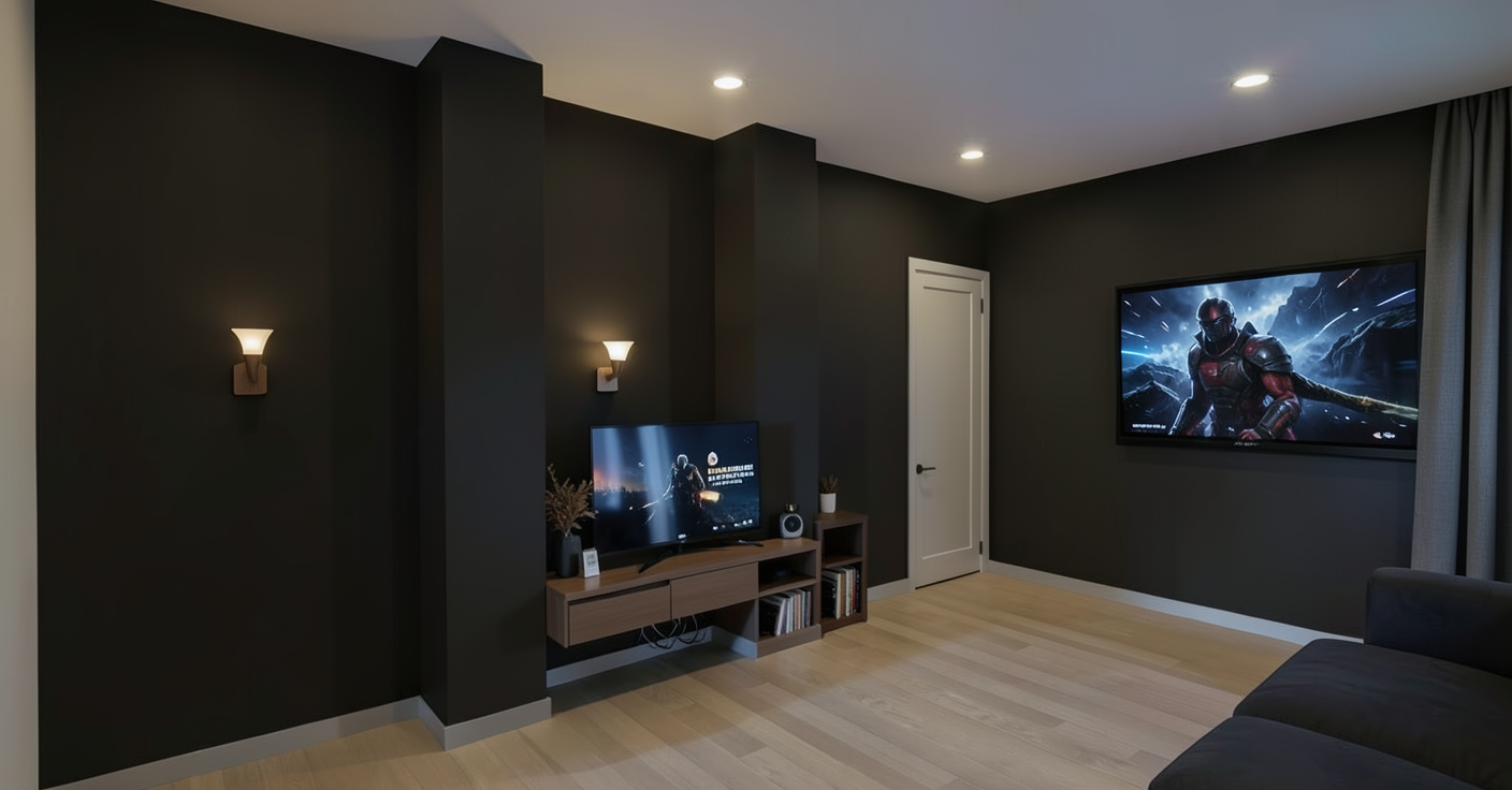 golf simulator room with black projector inside the room keep transom windows no sun shining in the windows and no art on the simulator room walls
