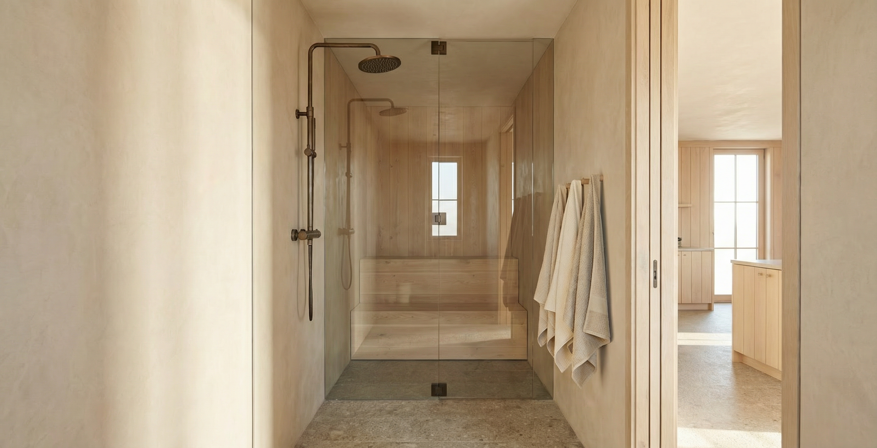 remove the cabinetry from the middle of the space to the right remove reflection in shower glass add sportova gym equipment in space seen through the door on the right add mirror on right directly opposite the door