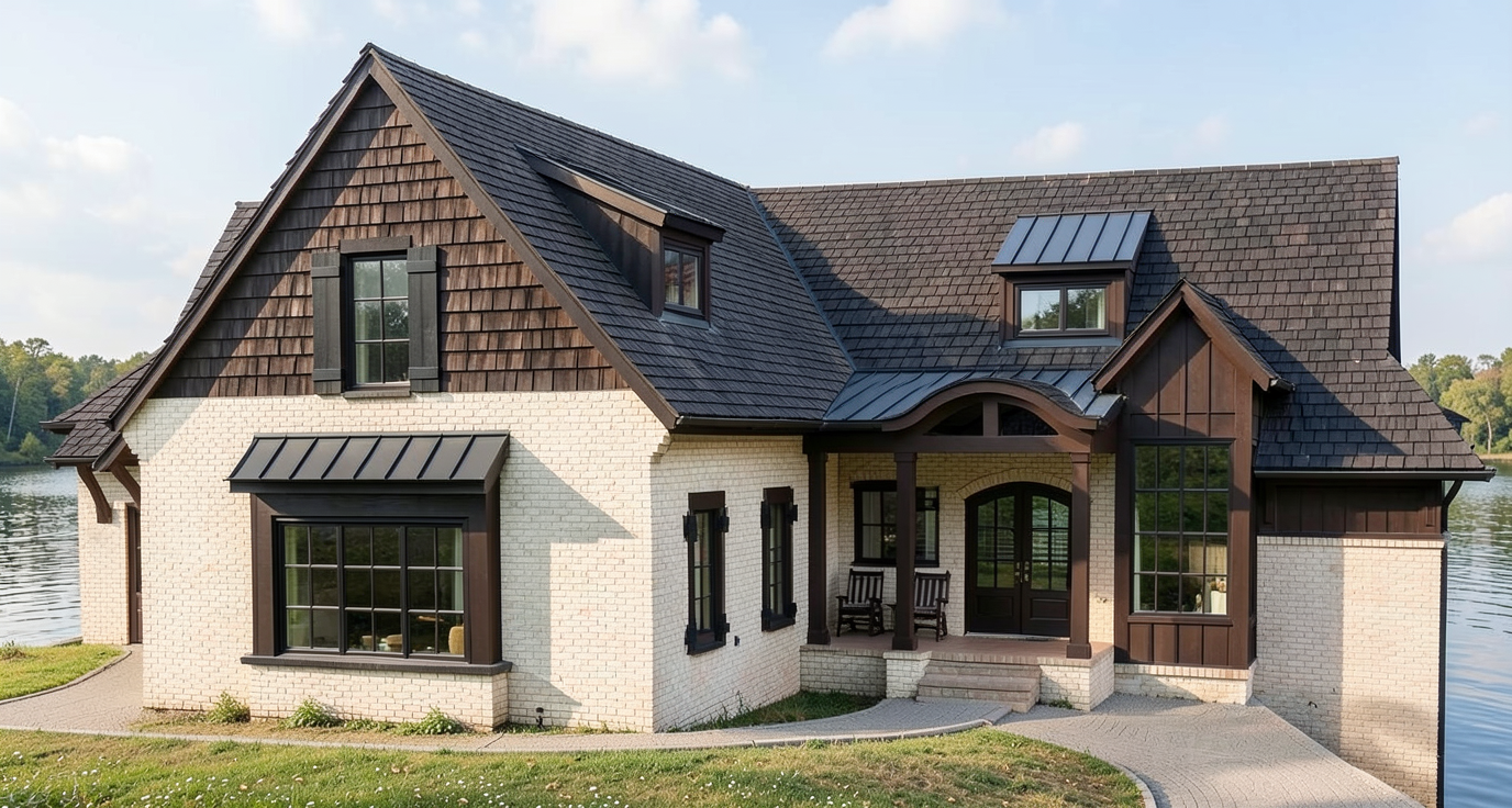 create an architectural cgi of a leisure site for elderly people in the foreground is paths and soft planting and a few trees to the left of the image next to the paths are timber framed sheltered canopies with comfy seating underneath and fire pits and picnic benches in the green spaces the blue pool on the left is a hot spring pool with people swimming in it and the pool in front of the building in the middle is a swimming pool the main building in the middle is made from timber and white stucco in the background on the left up the hill is holiday lodges the background is a few low level trees and distant field the lighting is soft and ambient