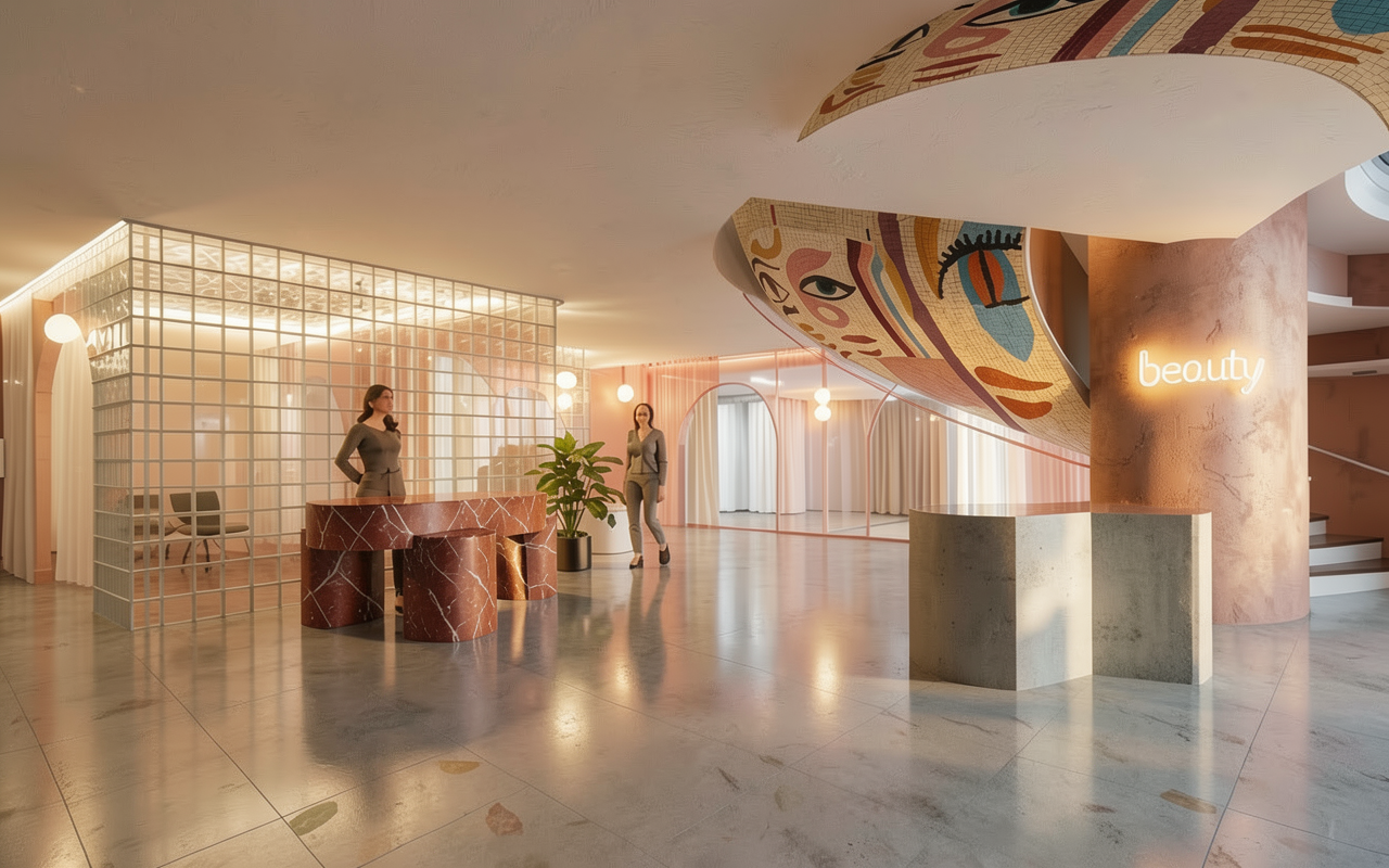 make the lighting in this image feel more intimate like a day spa ambient lighting only show a warm light concrete aggregate floor finish show hidden recessed lighting channels in the ceiling around the walls