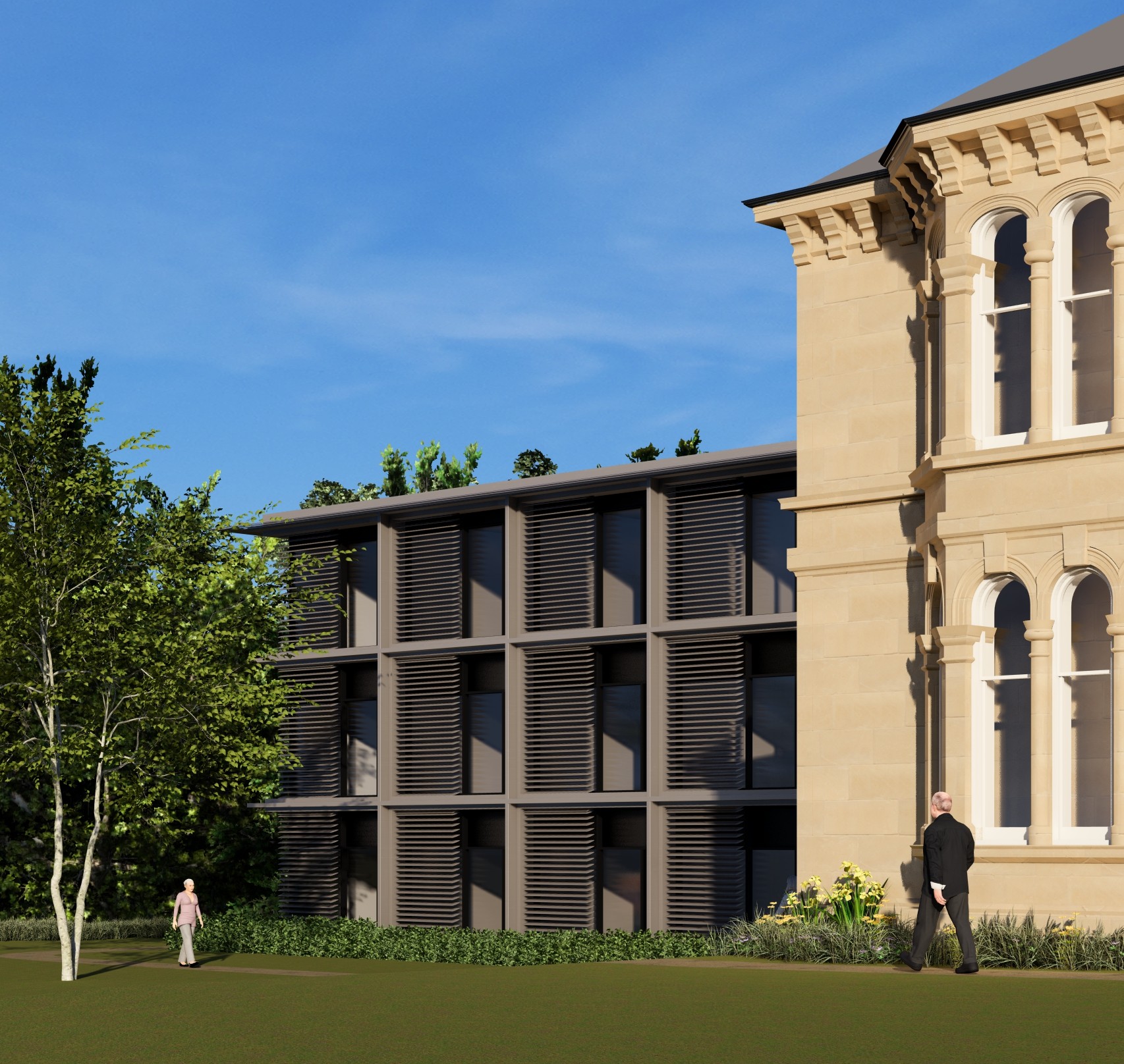 add realism make sure it is clear that the modern addition is set back from the old building make the modern extension seem subservient neutral tone