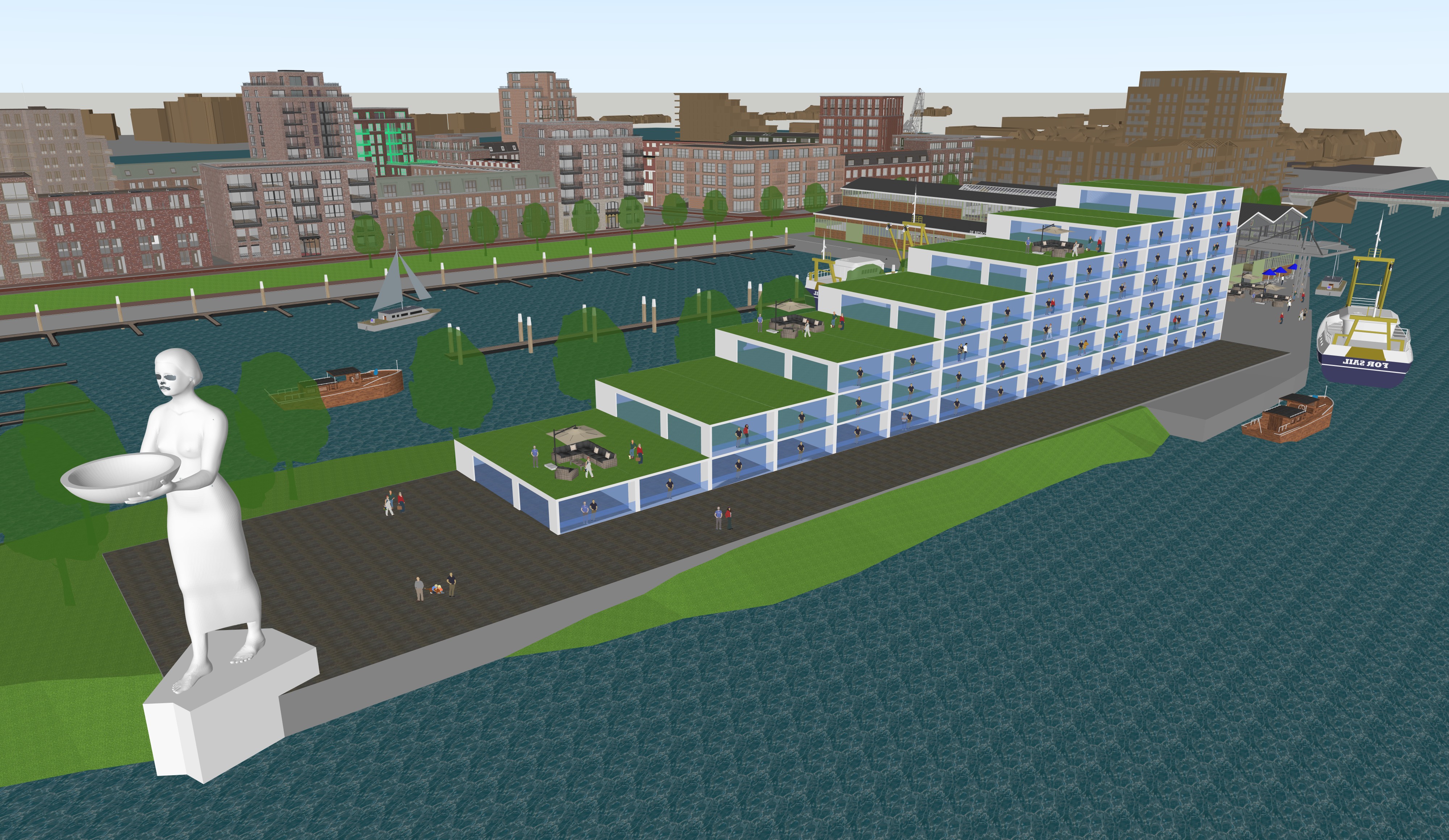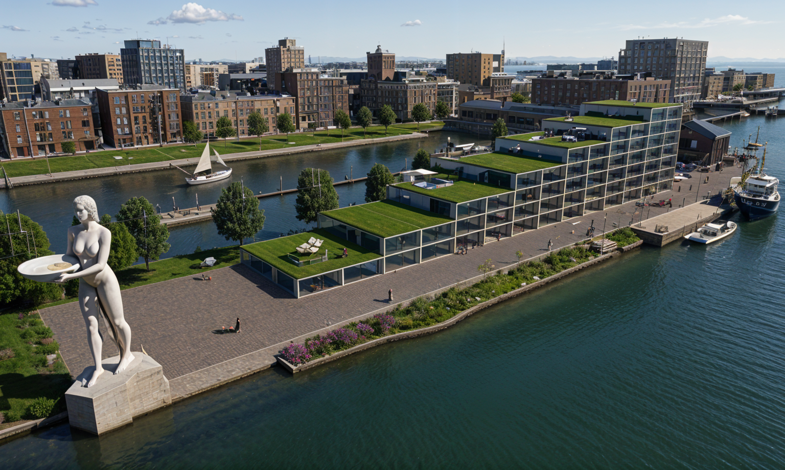 add a few boats with recreating people on the water the building has green roof terraces pon every floor with lots of people and terrace furniture and lots of plants and flowers on it the space around the building is a vibrant city space with lots of people and plants and flowers the weather is sunny with a few clouds