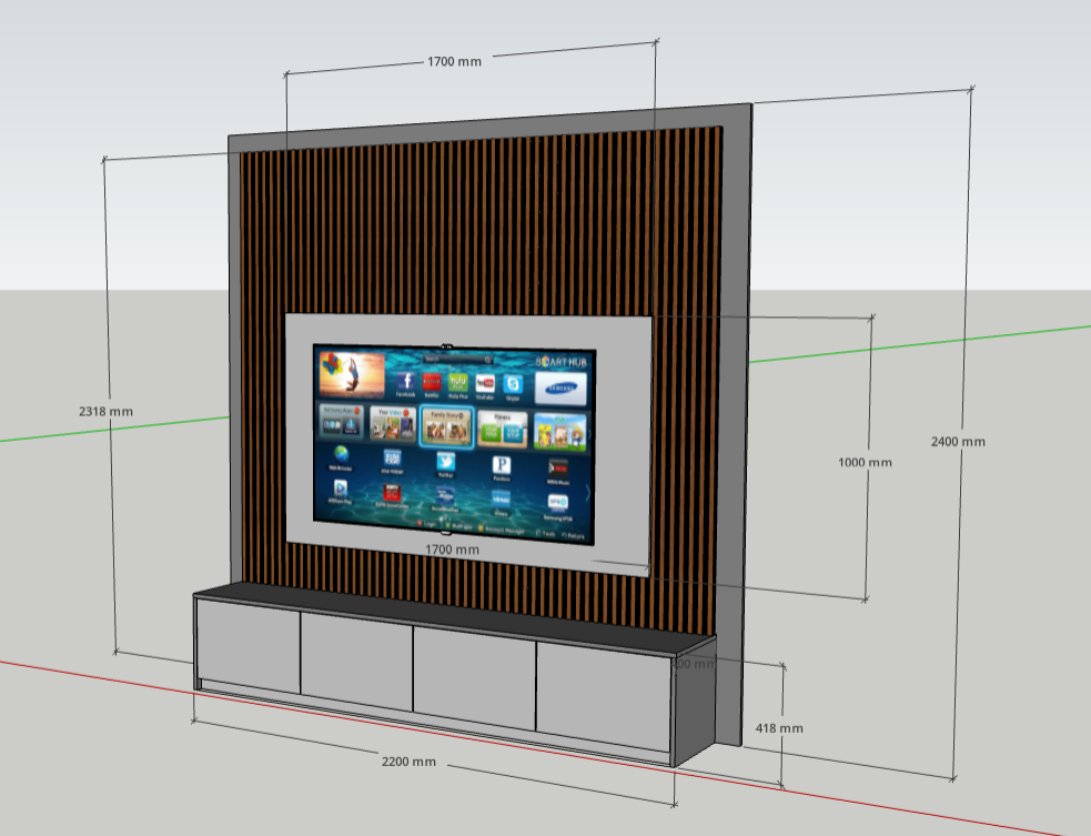 this is a sketchup model of a wall mounted tv unit the tv is a 50 tv use the provided sketchup model as the exact base do not alter structure proportions or layout ultra photorealistic interior render of a contemporary living room tv unit wall