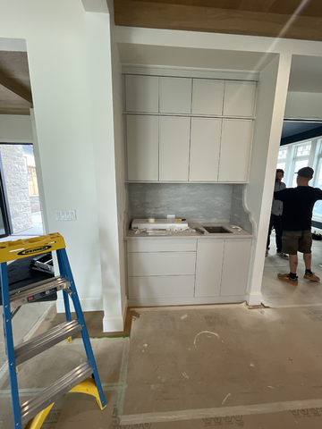 do not change the cabinets in any way preserve the exact cabinet colors materials finishes dimensions door and drawer styles hardware spacing alignment and all geometry exactly as shown do not alter the countertop shape backsplash appliances flooring lighting fixtures or wall structure only remove the construction materials clutter and mess from the scene clean the room and make it look finished and staged add a few simple tasteful home accessories appropriate for the style of the space but do not add or remove any furniture windows or architectural elements maintain the original lighting direction and realism enhance clarity and polish the photo while keeping the cabinetry and room design completely unchanged do not alter the lighting to keep the cabinet colors as they are in the image add new flooring stage the countertop for a simple wet bar put gold hardware on the door and drawer fronts
