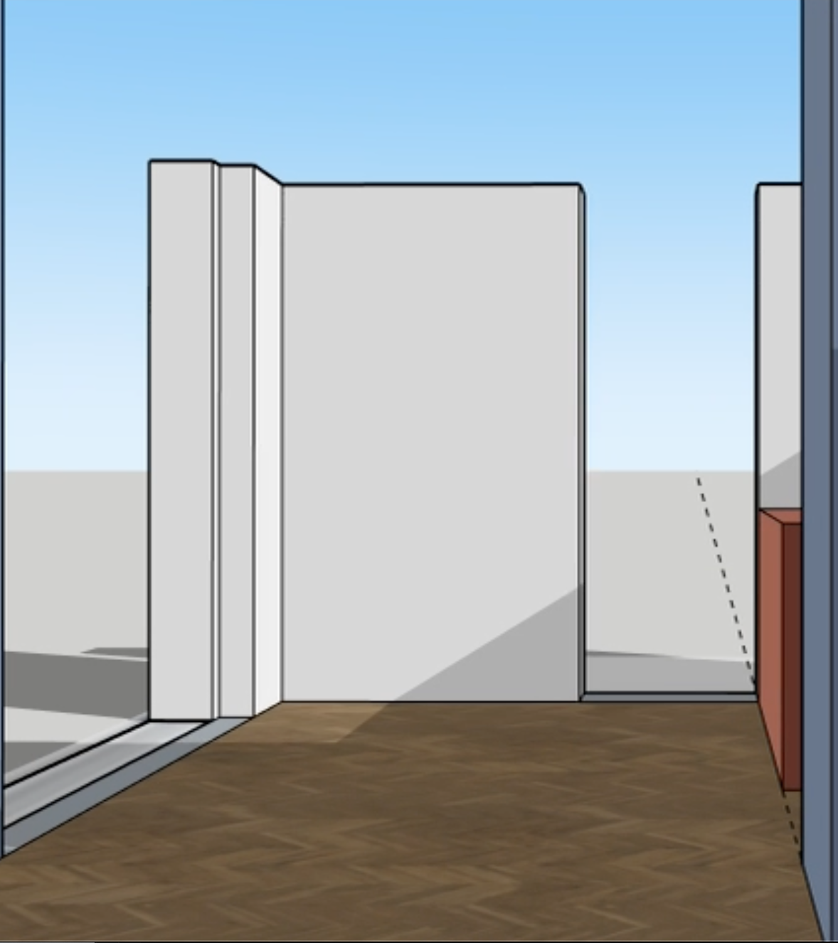 in the open space between the walls add windows make the floor long pale oak floorboards and the walls a white clay plaster architecture