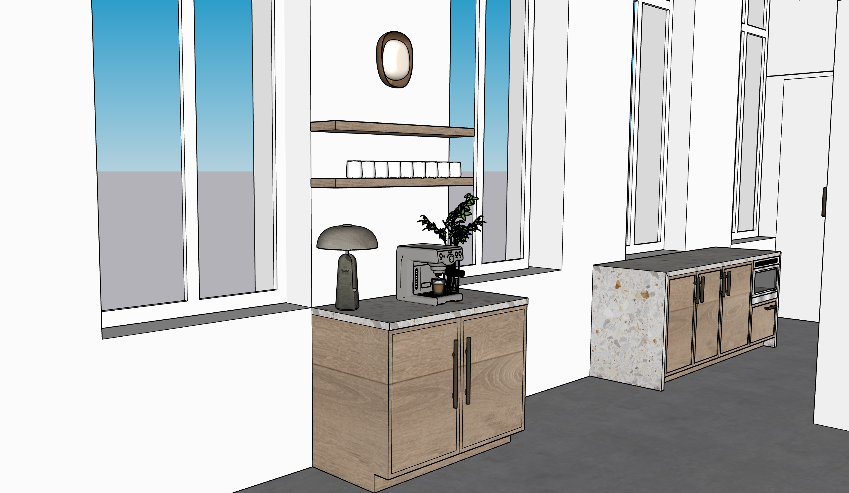 please make the lighting soft even warm and bright keep material as they are shown in the image make the material on the cabinet front white oak make the walls white make the view outside the window have a fire escape and buildings