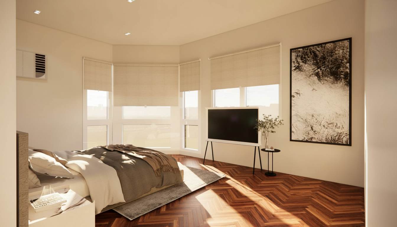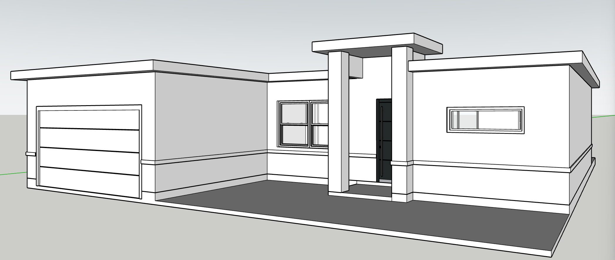 perspective shot generate a photorealistic video or high resolution image of a modern florida style single story house based on the architectural proportions shown keep the same realistic lighting colors and materials as the previous image do not change the design or materials adjust the camera angle to show the full left side of the garage and the complete front fa ade maintaining a natural perspective with visible depth toward the driveway and lawn materials and colors smooth stucco walls in light beige white trims and fascia dark gray architectural shingle roof black or charcoal gray modern front door with horizontal panels white modern flat panel garage door clear reflective glass on all windows with white aluminum frames driveway in light gray pavers green grass lawn and low shrubs along the base lighting and environment late afternoon sun with soft shadows clear blue sky and one palm tree in the background realistic reflections on windows and balanced contrast framing instructions maintain camera at eye level slightly angled from the left front corner to include the side wall of the garage leave space around the house so the entire fa ade and context are visible keep all architectural proportions identical to the model