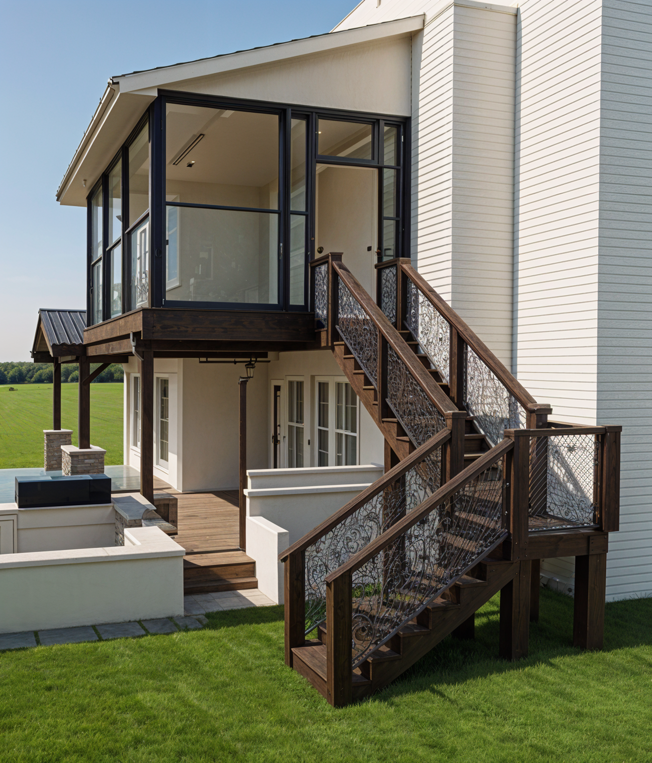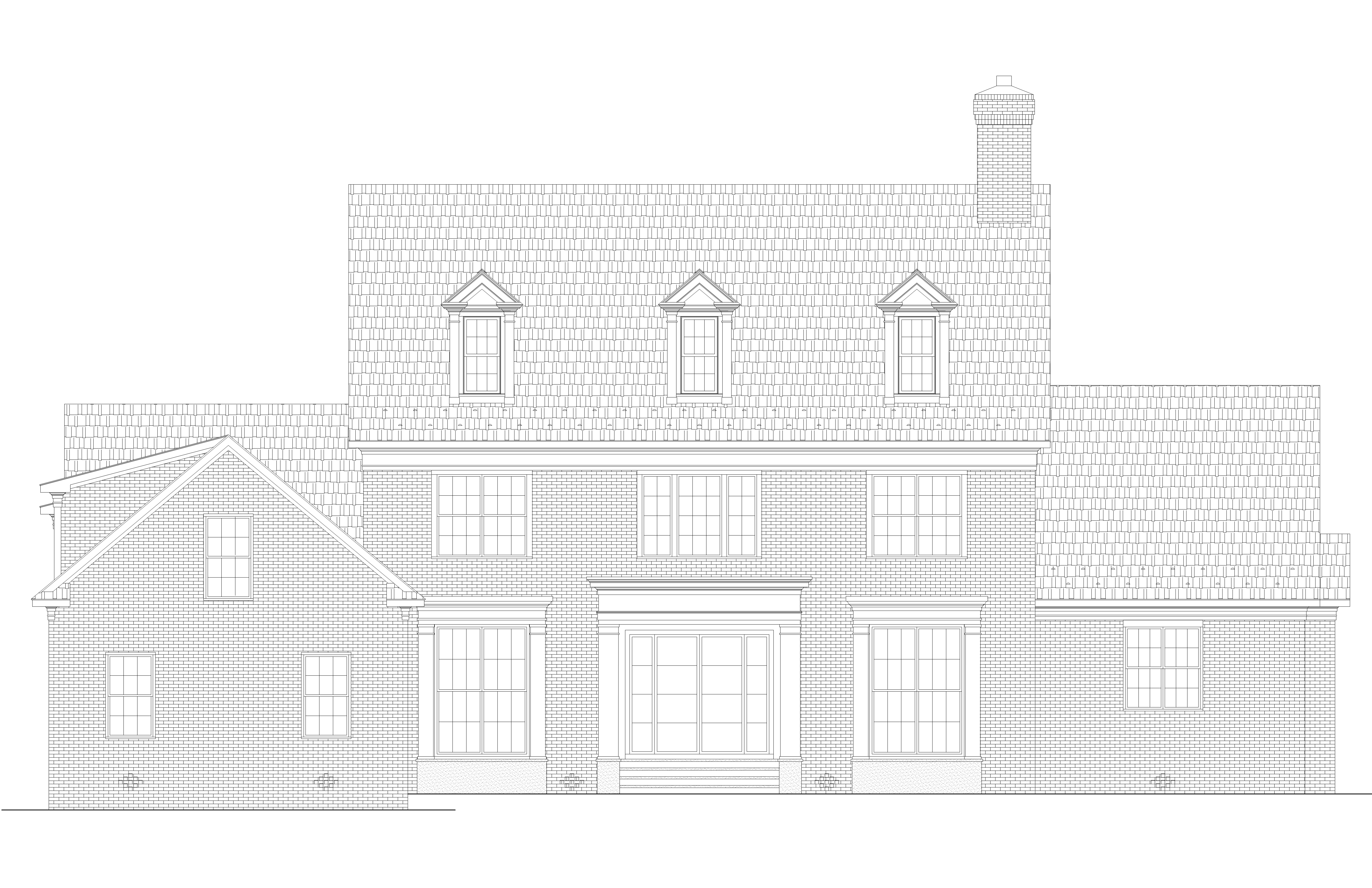 front elevation brick painted cream color with white trim dark grey shingles