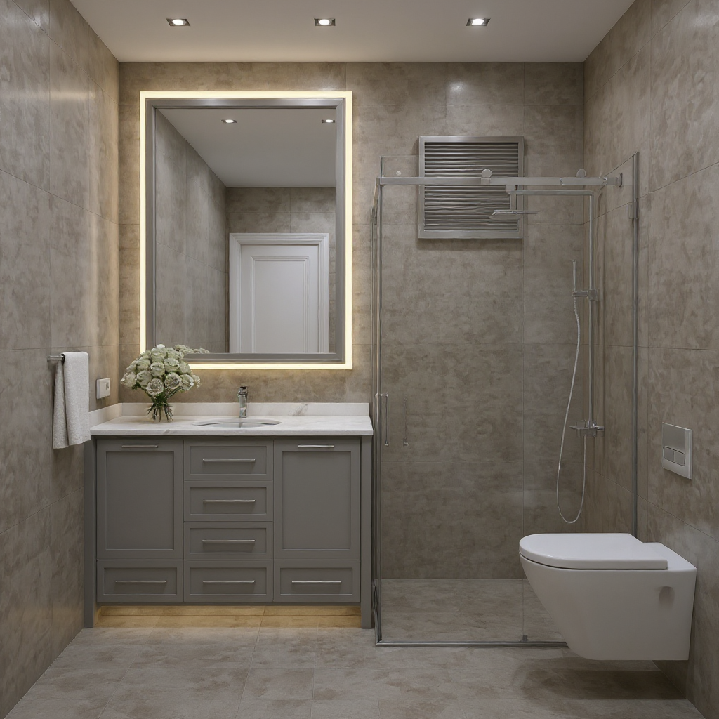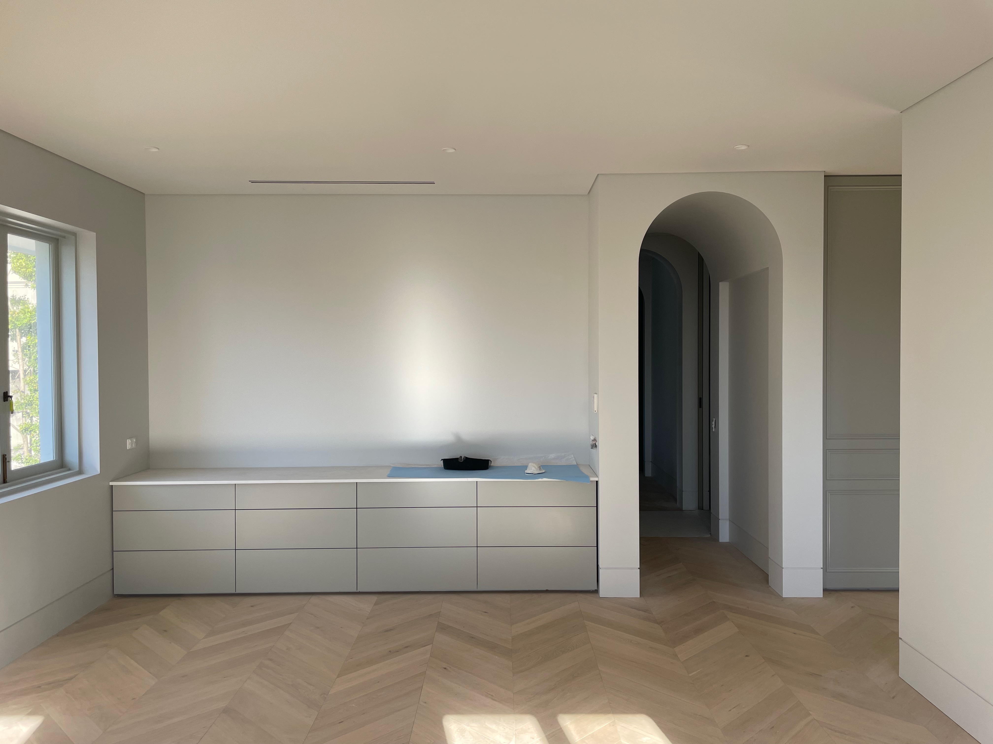 retain all architectural elements and arrangement including the cabinetry remove clutter from cabinetry bench and have a liaigre brizan table lamp on bench towards the left end add bed with it s head against the left wall only the edge of it will be visible in the foreground with most of the bed out of frame as the camera is looking over it bed to have austere luxurious oatmeal linen bed sheets including a natural sisal area rug centred under bed