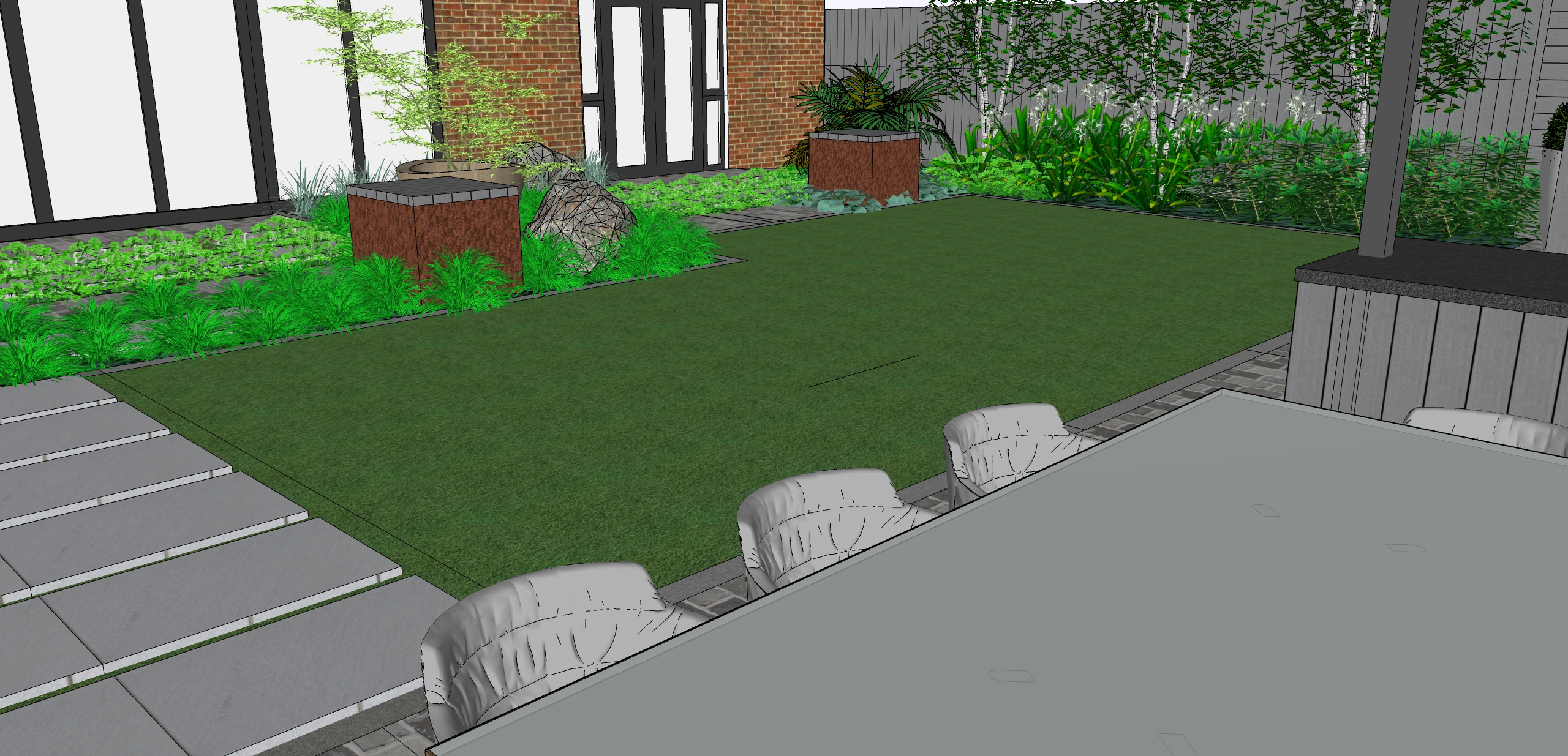 rusted steel cubes small stone boulders fence in background silver birch trees acer in pot dining table and chairs stepping stone flags in lawn stepping stone flags in planting sun shining on table house is in shade