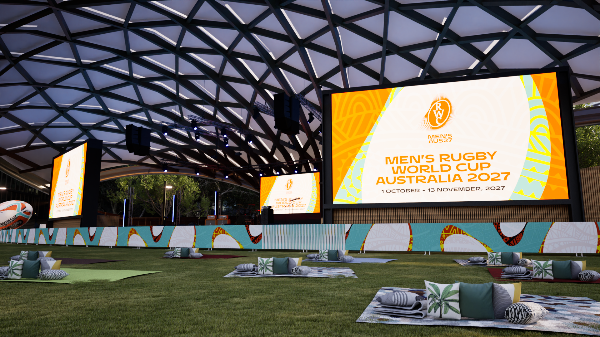 add a mix of 100 people sitting on the park benches and in the foreground and standing around watching sport 20 percent of them are cheering towards the screen include food and beers on the tables make the background a warm sunny day