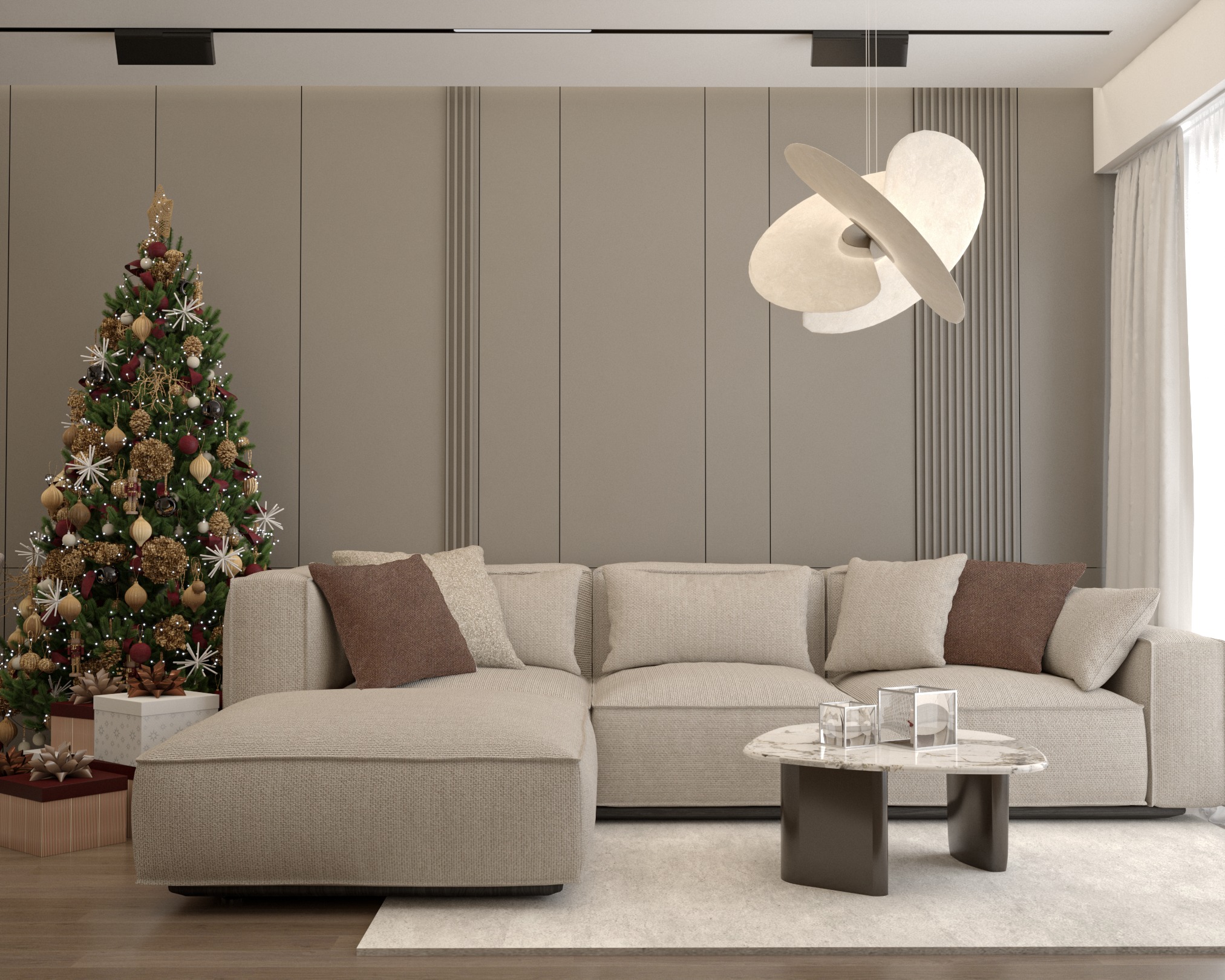 ultra photorealistic corona renderer style interior visualization architectural photography preserve original architecture preserve exact geometry preserve layout preserve furniture preserve materials realism enhancement only no redesign physical based rendering accurate global illumination ray tracing soft contact shadows ambient occlusion realistic light bounce color bleeding ultra realistic materials with correct pbr values realistic roughness subtle imperfections micro surface details fine texture depth natural material variation professional interior photography full frame camera 24mm lens correct exposure realistic dynamic range soft highlight rolloff natural daylight simulation realistic window light soft indirect lighting cinematic but natural balance corona renderer v ray unreal engine 5 quality 8k resolution ultra sharp extremely detailed photorealistic professional archviz architectural digest magazine quality no design change no new objects no new furniture no layout change no geometry change enhancement only preserve everything reduce the intensity of natural daylight entering the space decrease exterior brightness and window light exposure to create a softer more controlled interior lighting atmosphere prioritize warm ambient and artificial lighting from chandeliers and interior fixtures maintain balanced exposure with subtle shadows and a more intimate evening mood suitable for a luxury wedding restaurant do not change the architecture window positions layout or design elements adjust lighting only remove the lightning chandelier from the wall