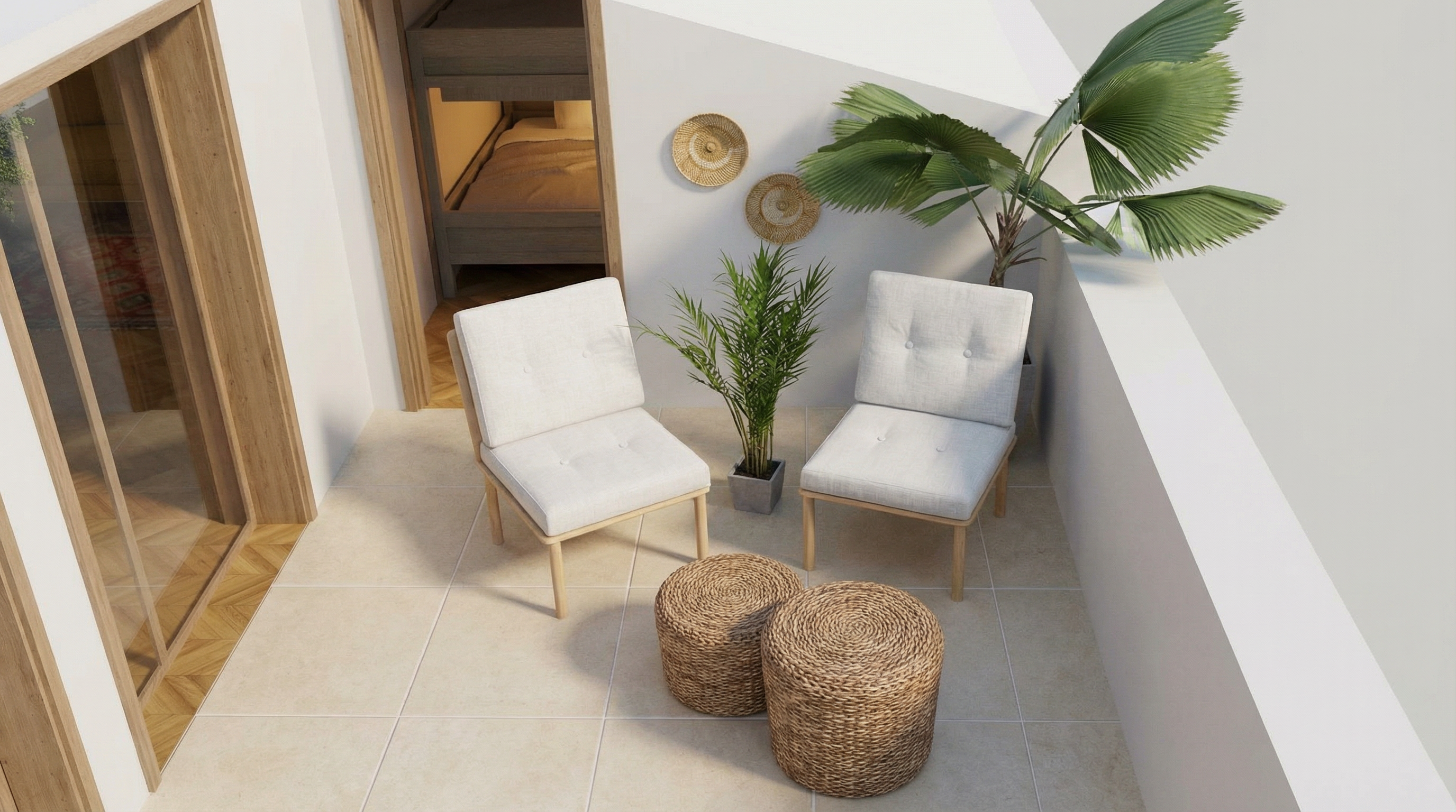 unify image and sketch into a photorealistic view the left piece of furniture sketch should be matched to the existing furniture in color and material
