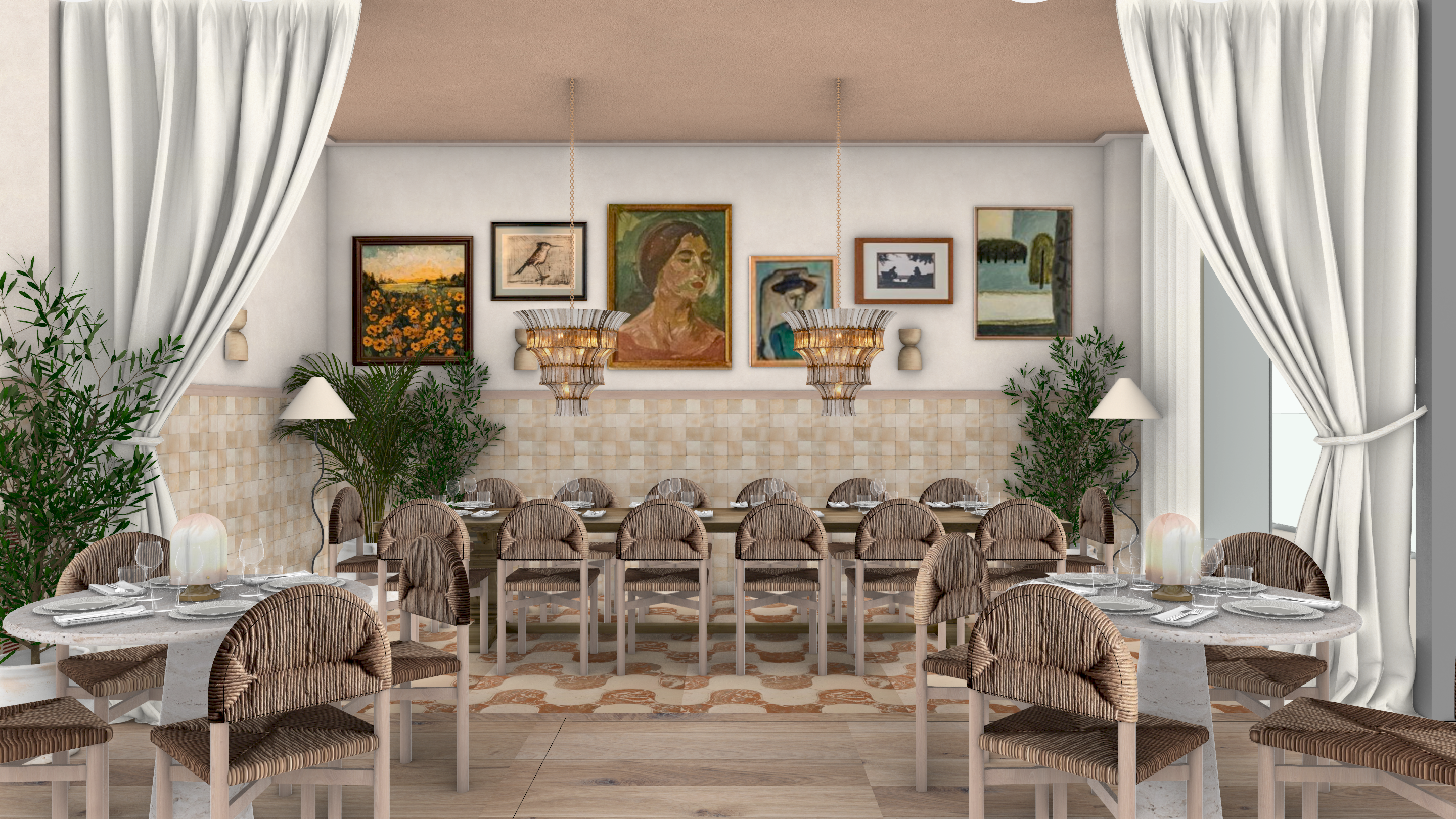 a cozy and elegant restaurant interior with a warm inviting atmosphere the scene is set with soft beige walls and a light terracotta ceiling large flowing white curtains frame the space adding a touch of sophistication the tables are adorned with smooth white marble tops complemented by chairs with woven brown fabric elegant chandeliers hang from the ceiling casting a soft golden glow the floor is a natural wood tone with an intricate beige and brown patterned rug adding warmth framed paintings on the walls feature earthy tones of green orange and blue lush green potted plants bring life and freshness to the setting the overall atmosphere is calm stylish and welcoming perfect for an intimate dining experience