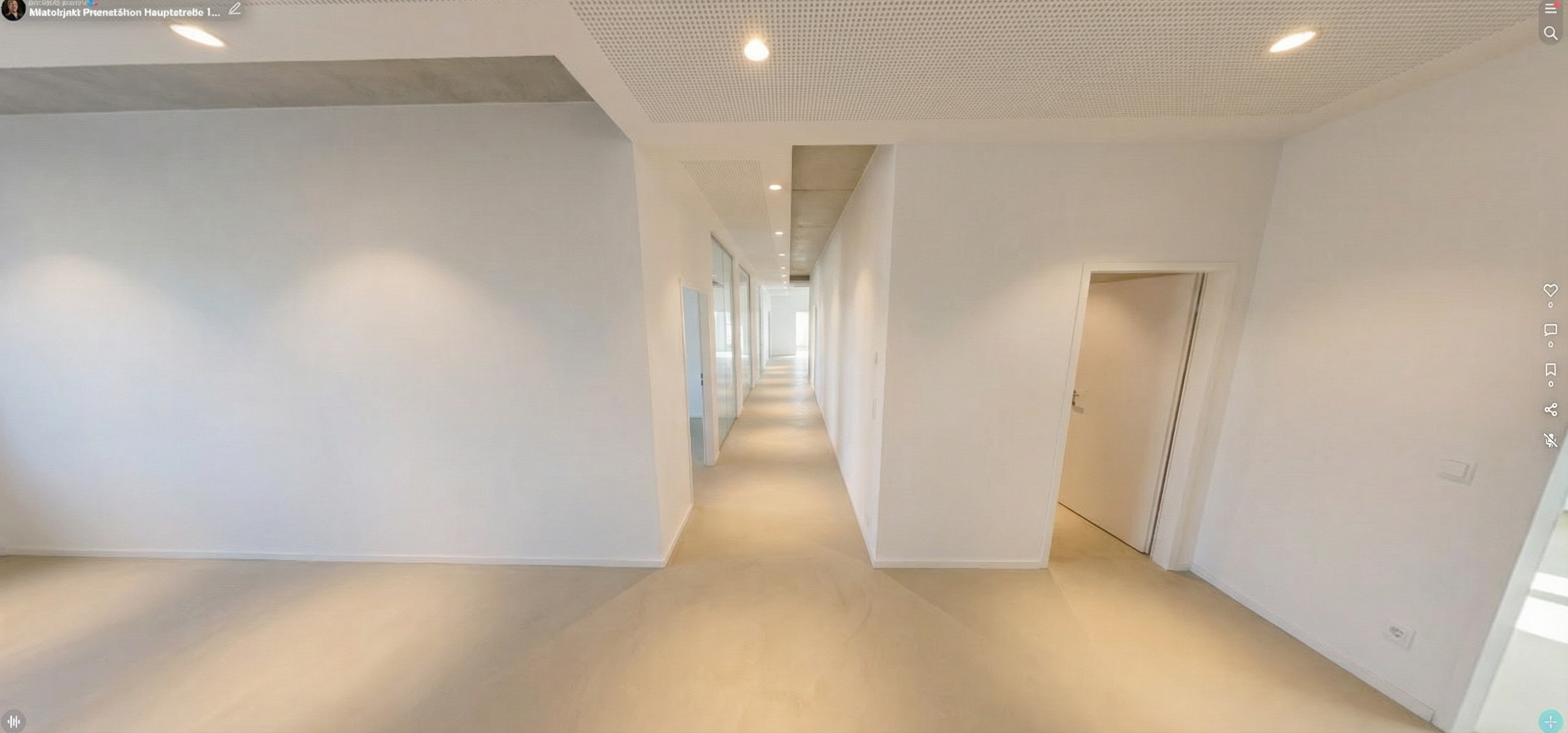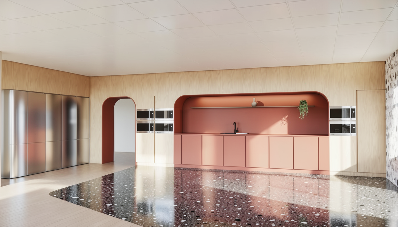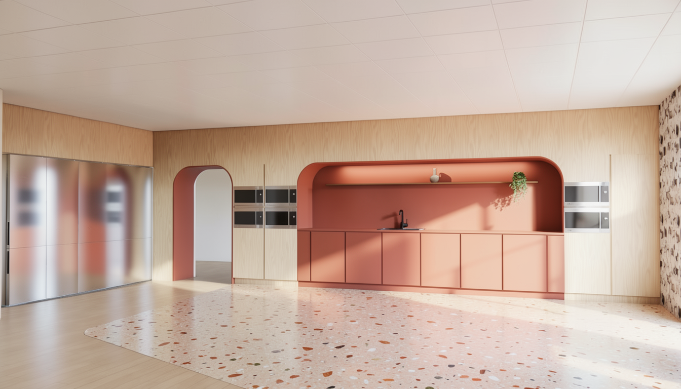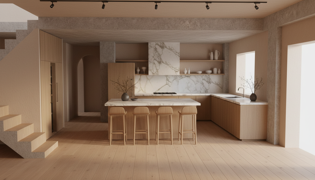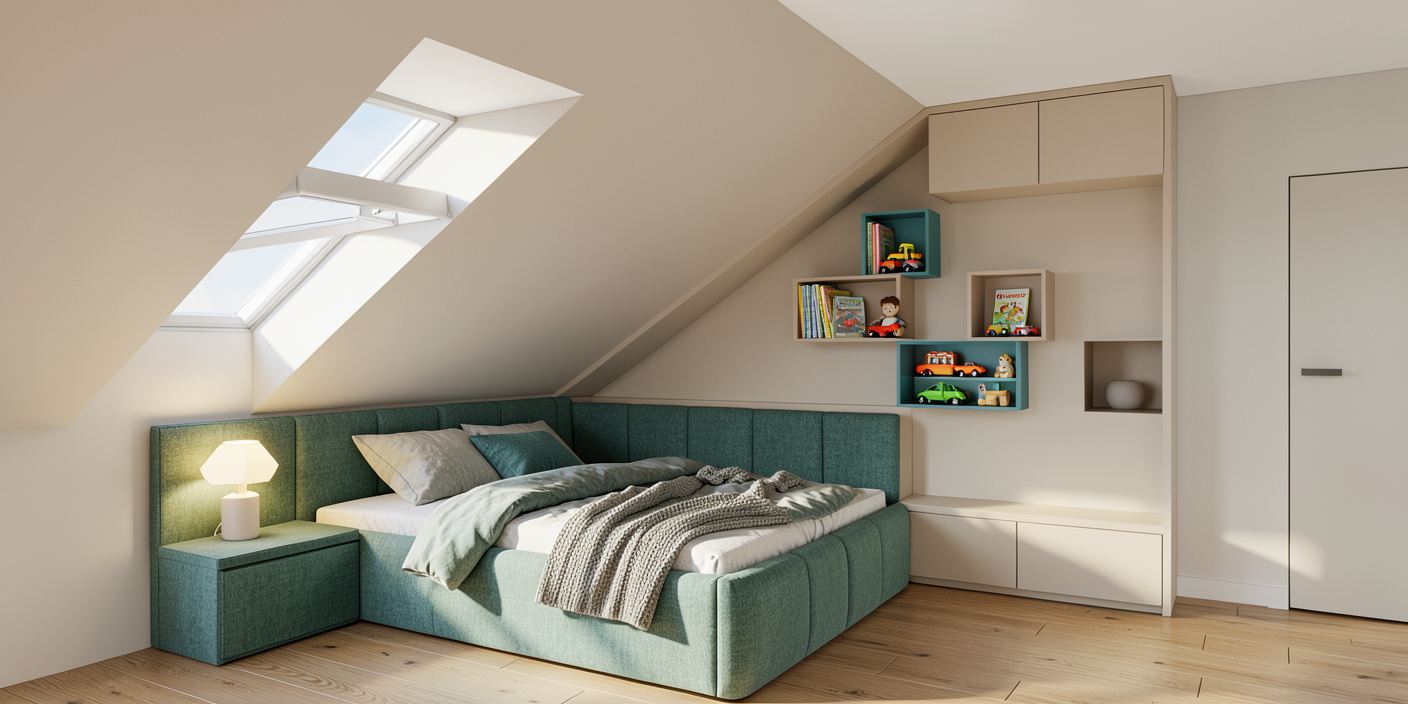 photorealistic interior render based on an existing 3d model contemporary parisian apartment interior bedroom open onto an ensuite bathroom top floor 7th floor bedroom floor in blue carpet with realistic textile texture and soft light absorption bathroom floor in natural grey stone with matte finish and fine visible joints warm yellow lighting atmosphere realistic and soft combination of warm artificial lighting and natural daylight windows fitted with white linen roman blinds lightly textured fabric diffusing daylight behind the bed blue built in wardrobe with glass doors used as a wardrobe closet visible clothes inside softly illuminated by warm internal lighting realistic depth and reflections on glass bed headboard made of wood wall mounted bedside sconces fixed on the headboard made of clear transparent glass subtle light diffusion realistic reflections foreground sliding door made of fluted glass vertical ribbed texture translucent fully pocketed into the wall realistic light distortion and reflections accurate materials realistic proportions global illumination soft shadows high end architectural photography neutral and contemporary interior design