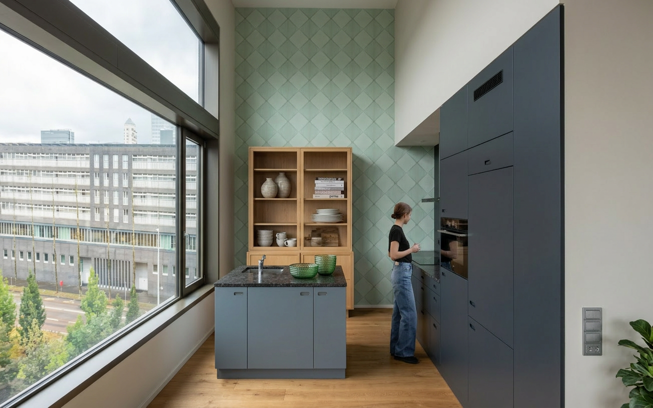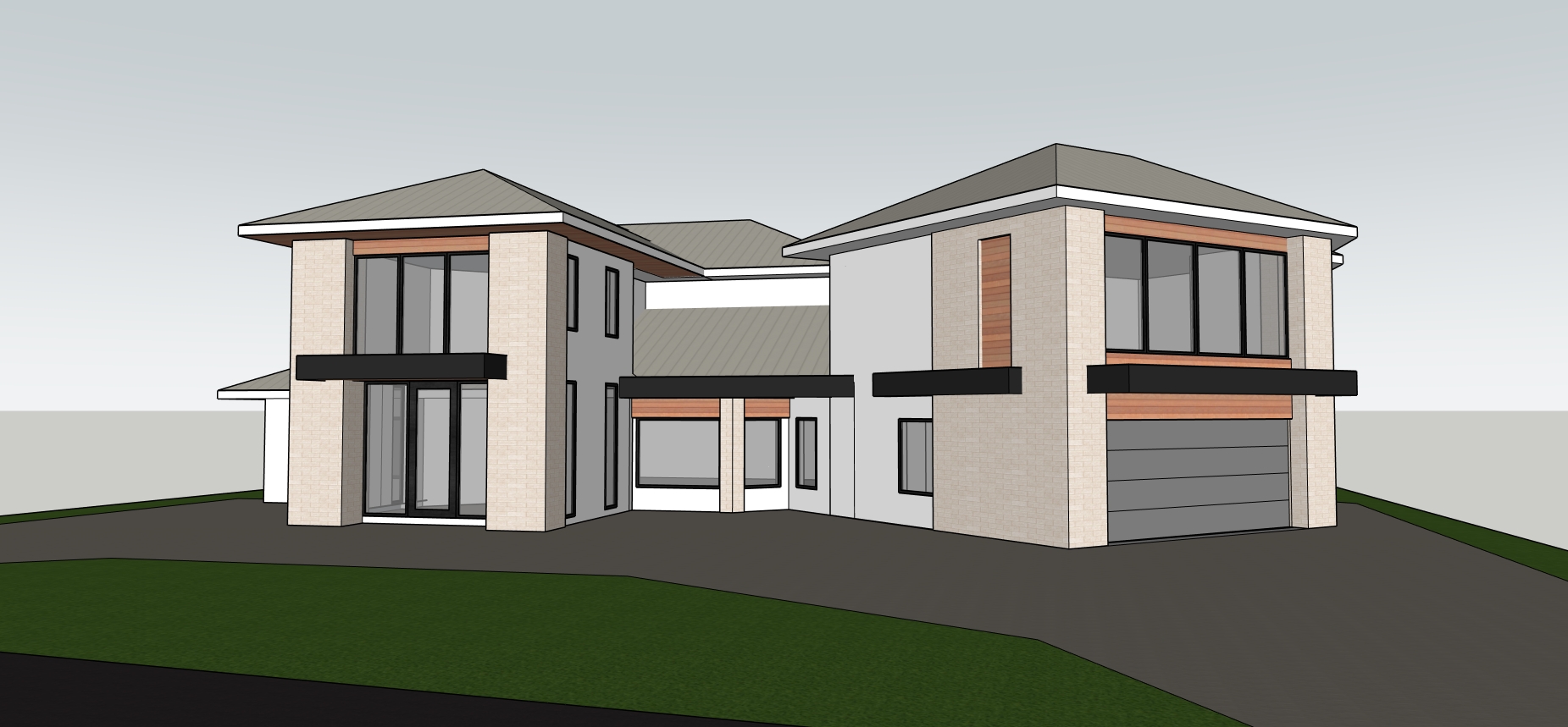 render a modern two story house with a sleek contemporary design the walls are off white with light beige stone accents the window frames and horizontal bands are a deep charcoal black the roof is a smooth light grey metal the wooden paneling under the roof line and above windows is a warm rich cedar brown the driveway is brick complementing the lush vibrant green lawn florida landscape set the scene in a serene early morning atmosphere with a soft overcast sky that casts gentle diffused lighting over the house