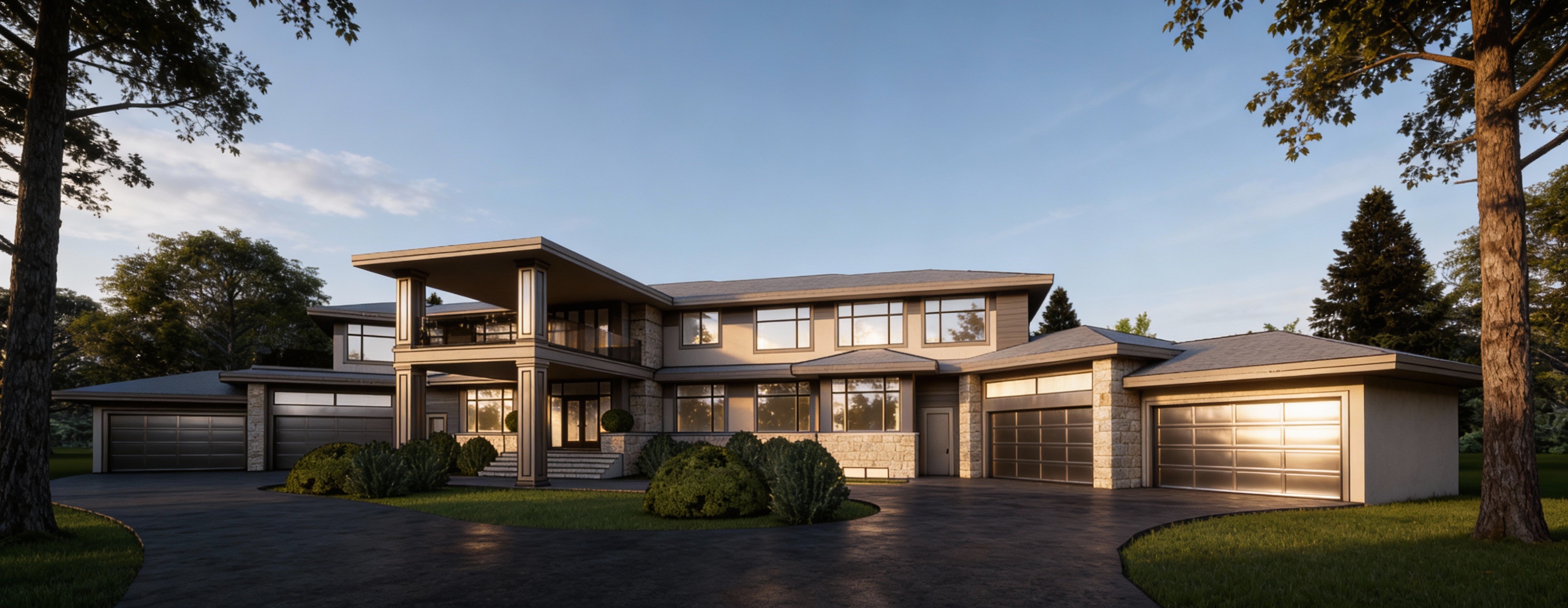 ultra realistic photorealistic suburban single family home exterior front elevation eye level architectural photography soft overcast daylight realistic shadows exterior materials and colors do not change cream colored brick masonry on all first floor exterior walls including the front left wall with large windows solid exterior wall brick below and around windows light gray horizontal vinyl siding on the second story dormer only light gray horizontal vinyl siding on the small front facing gable above the left side windows only dark charcoal asphalt shingle roof with realistic texture and thickness white painted trim on all windows doors fascia soffits and corners roof structure and geometry critical fully continuous closed roof surfaces with no gaps openings cutouts or missing planes upper left roof section is a complete solid roof plane correctly intersecting with adjacent roof planes no skylights no roof voids no interior visibility through the roof realistic roof overlaps ridgelines and valleys consistent with residential construction architectural accuracy all walls and roofs are opaque structurally correct and realistically constructed clear separation between brick and siding at proper floor lines and gable transitions no incorrect material bleeding no floating elements no transparency environment green lawn minimal landscaping neutral background professional architectural visualization high realism pbr materials sharp focus 4k detail