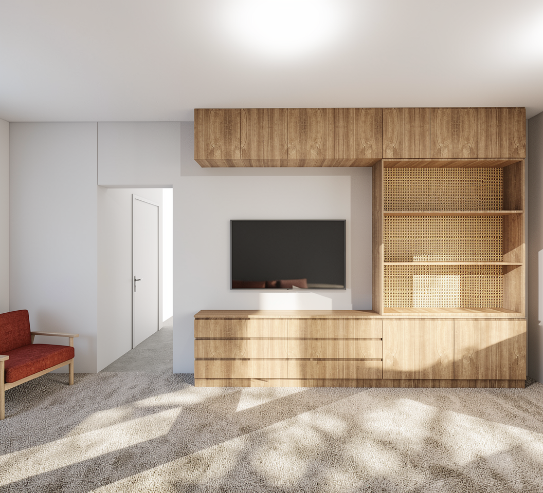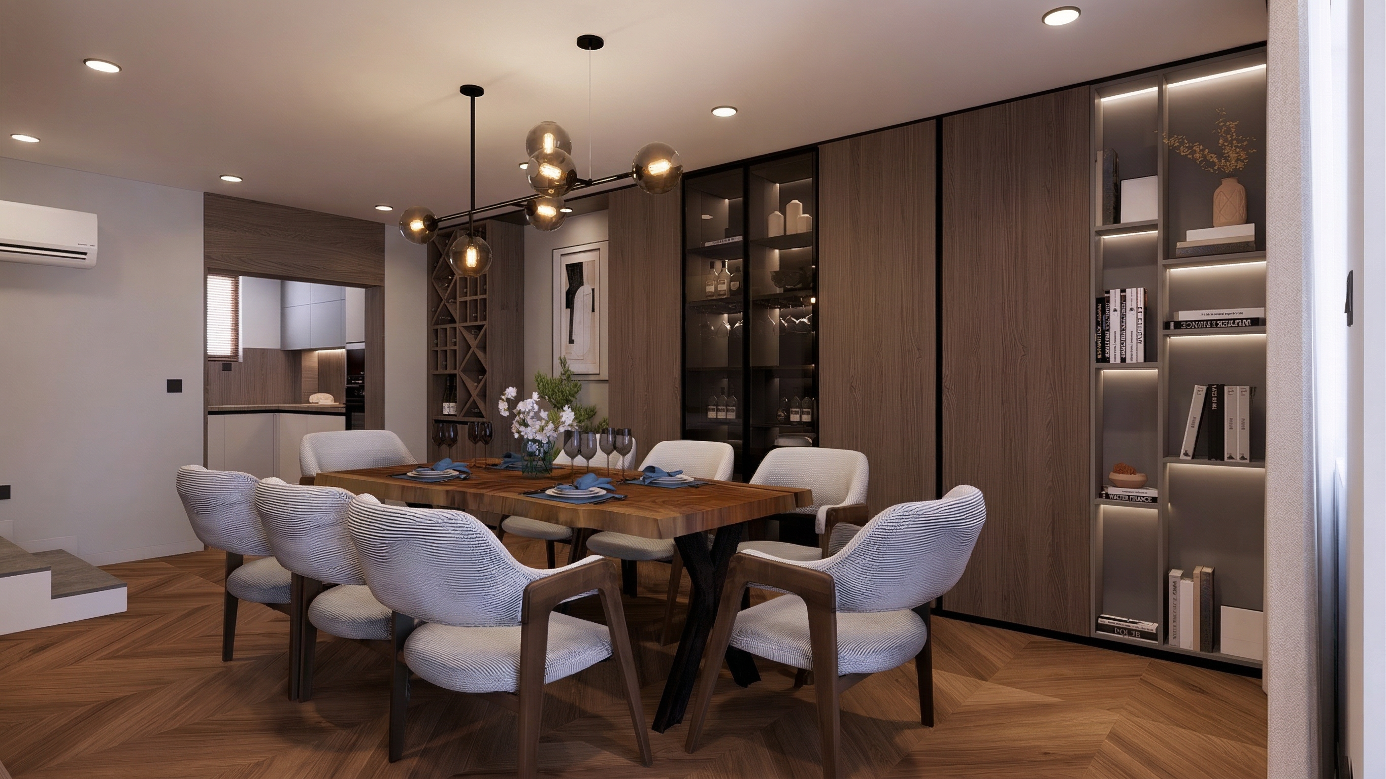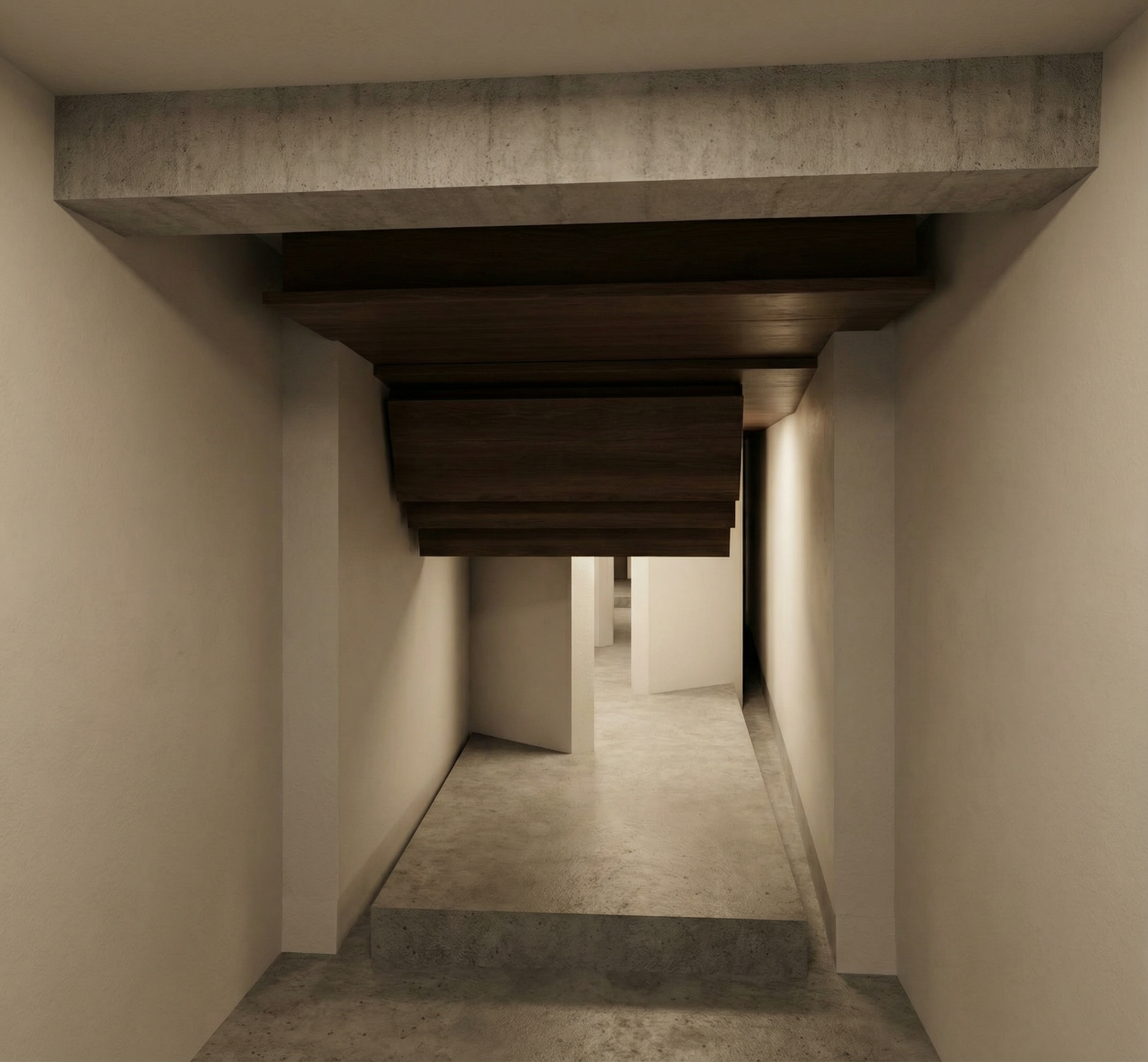 sarineen close up shot make this a sport center render located inside a campus in china make the concept simple woody yet aesthetic with nature make it look like a sport public space with people make it look like evening and dont use all wood combine with white grey make the room closed still architecture
