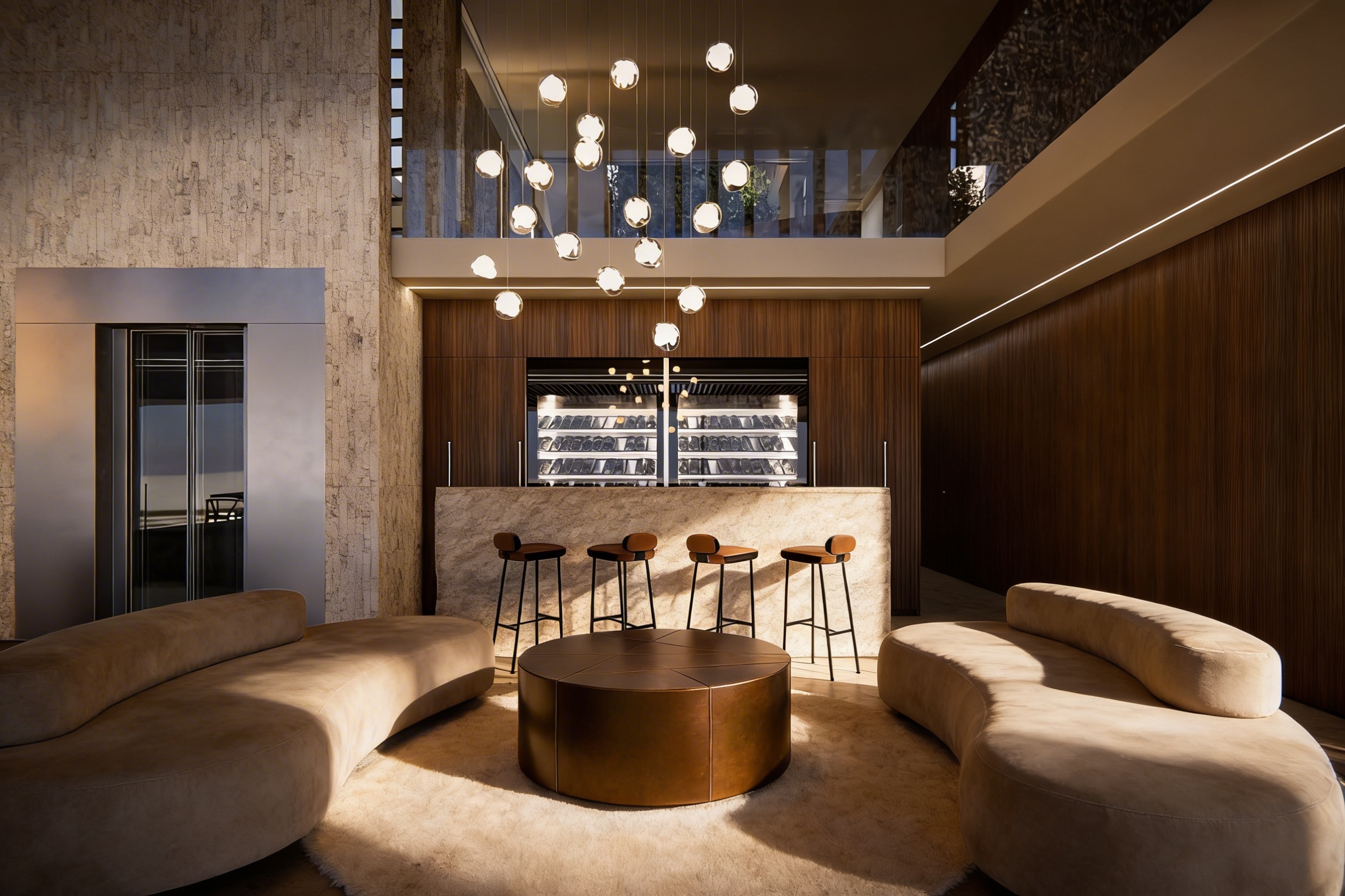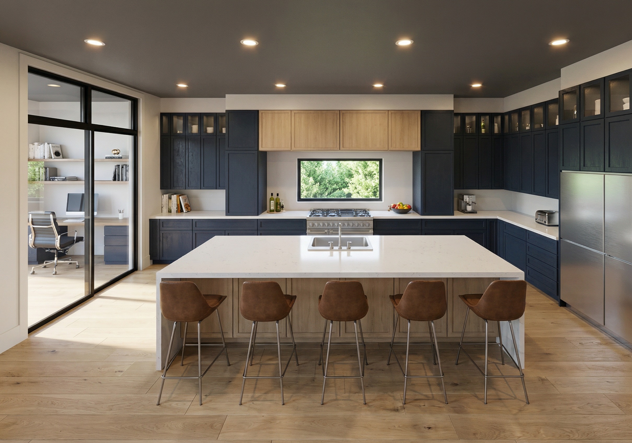 take cabinets all the way to the ceiling remove the glass cabinets and replace will solid door cabinets change color of all cabinets to a charcoal grey
